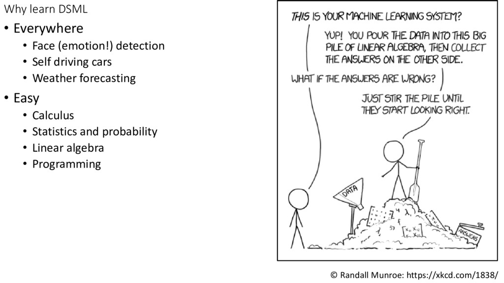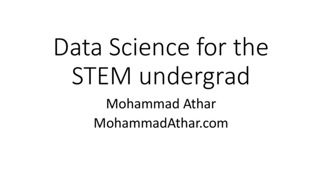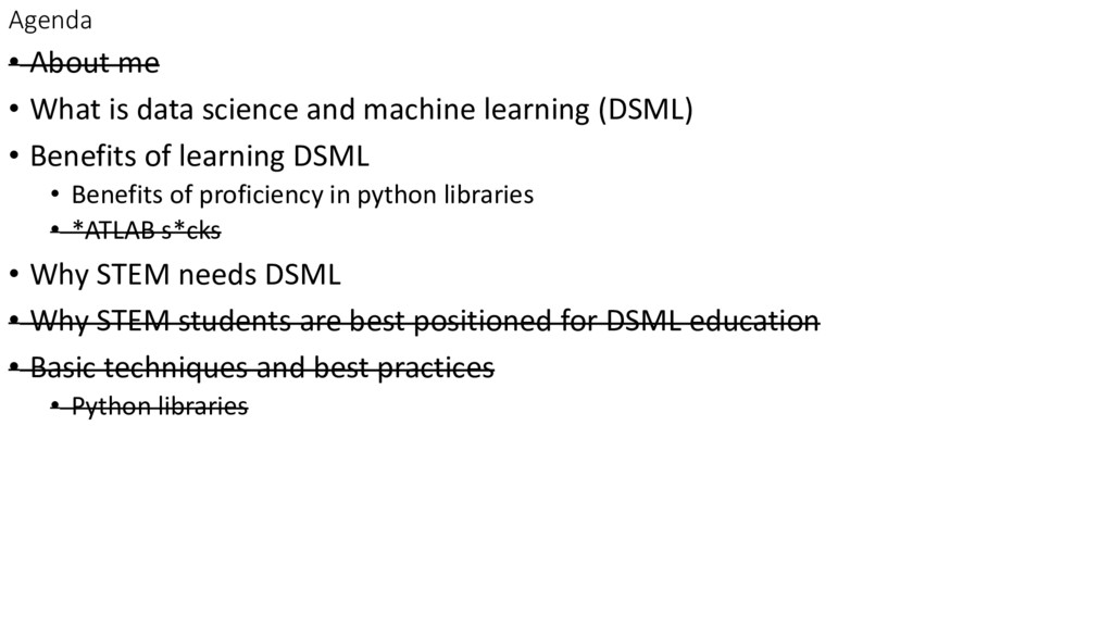 machine learning (DSML) • Benefits of learning DSML • Benefits of proficiency in python libraries • *ATLAB s*cks • Why STEM needs DSML • Why STEM students are best positioned for DSML education • Basic techniques and best practices • Python libraries