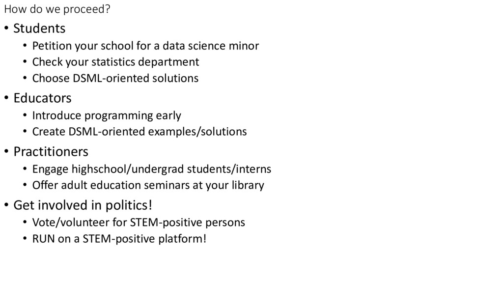 for a data science minor • Check your statistics department • Choose DSML-oriented solutions • Educators • Introduce programming early • Create DSML-oriented examples/solutions • Practitioners • Engage highschool/undergrad students/interns • Offer adult education seminars at your library • Get involved in politics! • Vote/volunteer for STEM-positive persons • RUN on a STEM-positive platform!