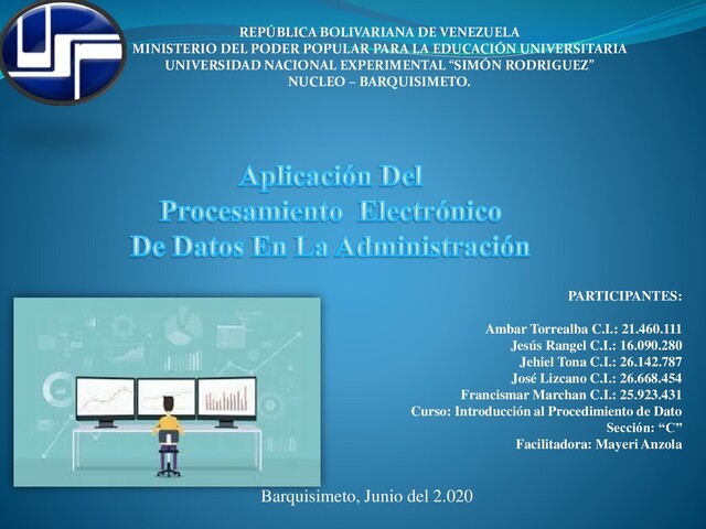 Tona C.I.: 26.142.787 José Lizcano C.I.: 26.668.454 Francismar Marchan C.I.: 25.923.431 Curso: Introducción al Procedimiento de Dato Sección: “C” Facilitadora: Mayeri Anzola REPÚBLICA BOLIVARIANA DE VENEZUELA MINISTERIO DEL PODER POPULAR PARA LA EDUCACIÓN UNIVERSITARIA UNIVERSIDAD NACIONAL EXPERIMENTAL “SIMÓN RODRIGUEZ” NUCLEO – BARQUISIMETO. Barquisimeto, Junio del 2.020