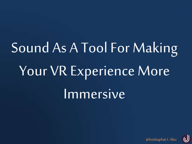 01 | About Me 02 | What Is Sound? 03 | How Is Sound Useful In VR 04 | How Do We Use Sound In VR? 05 | General Guidance For Using Sound In VR 06 | Audio Effects, Audio Mixer & Audio Format In Unity 07 | Additional Resources Jehoshaphat I. Abu