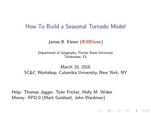 (@JBElsner) Department of Geography, Florida State University Tallahassee, FL March 10, 2016 SC&C Workshop, Columbia University, New York, NY Help: Thomas Jagger, Tyler Fricker, Holly M. Widen Money: RPI2.0 (Mark Guishard, John Wardman)