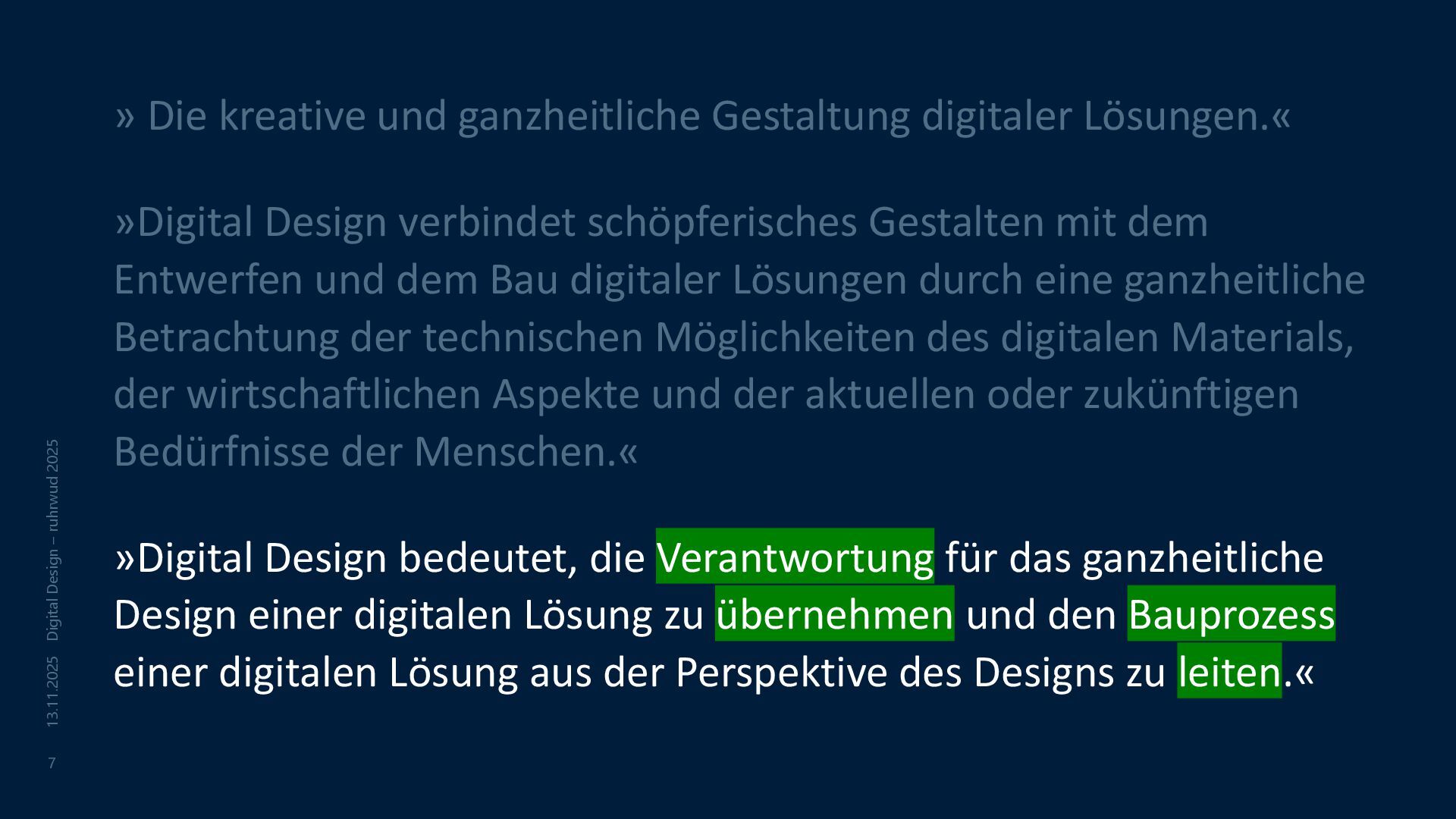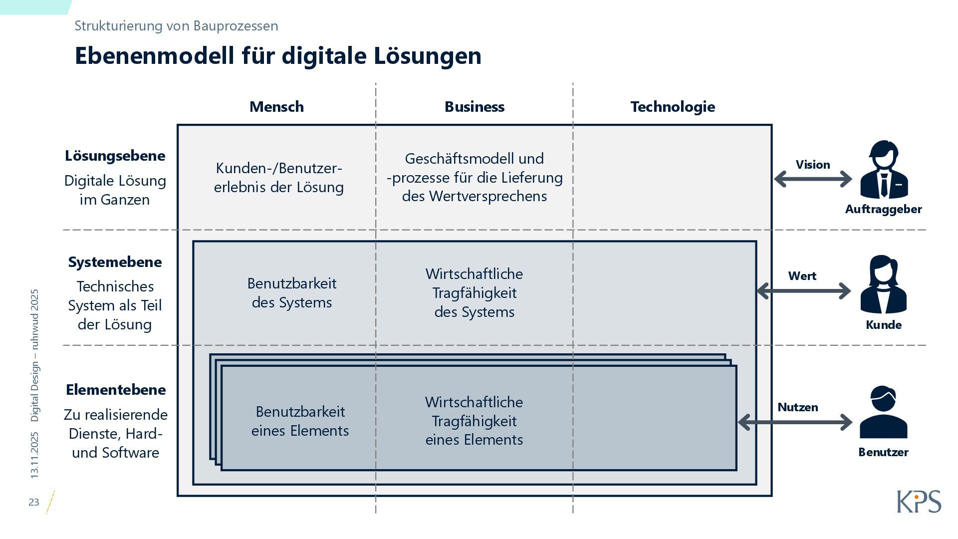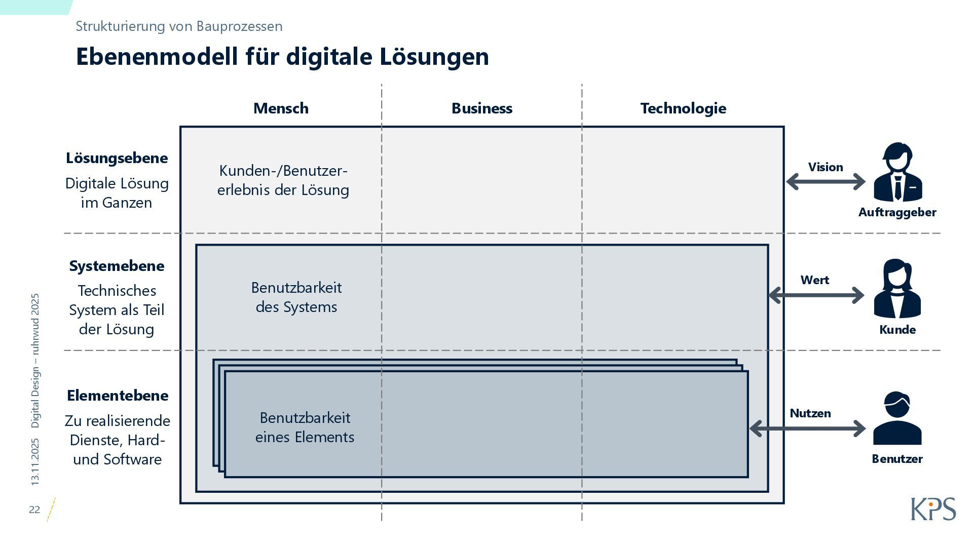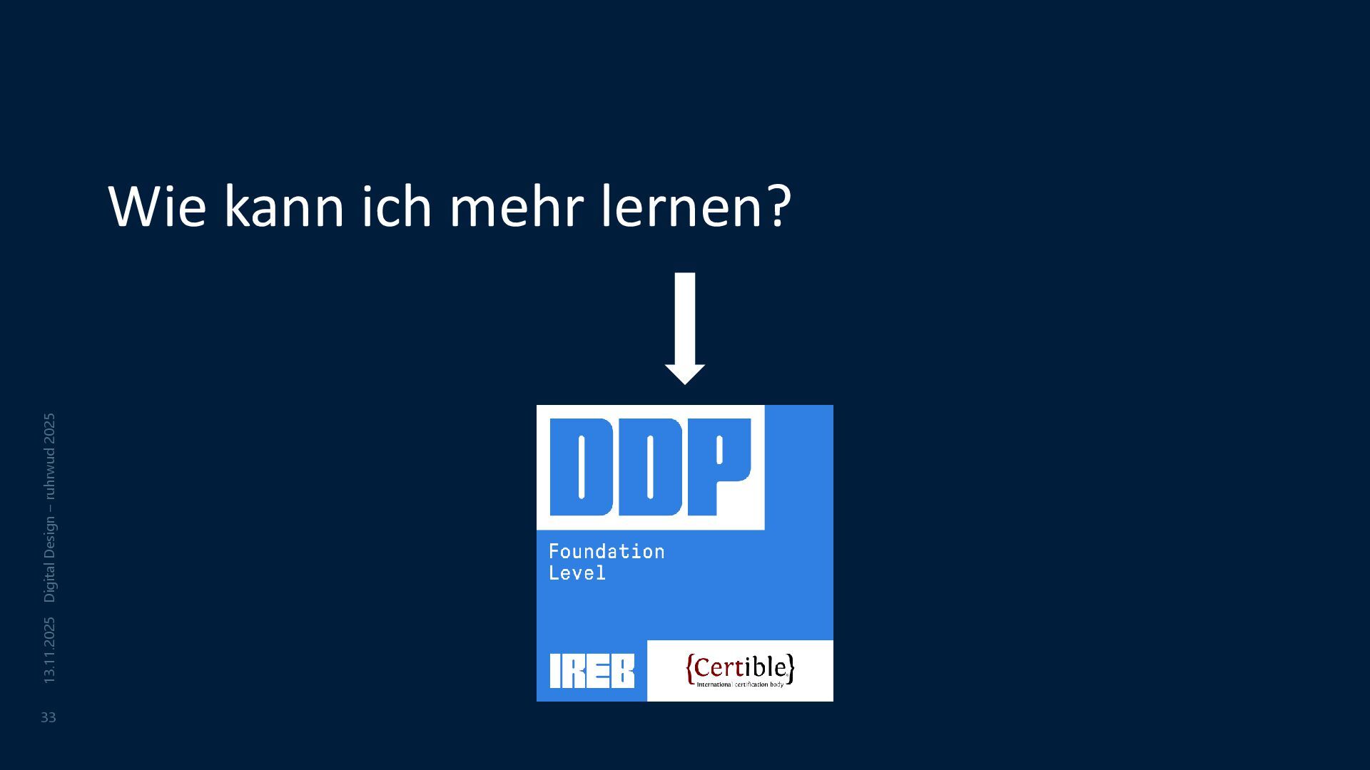 Digital Design bietet einen umfassenden Ansatz zur Gestaltung digitaler Lösungen, der Mensch, Business und Technologie ganzheitlich vereint. Analog zu Architektur oder Industriedesign etabliert sich Digital Design als eigenständiges Berufsbild mit dem Fokus, erfolgreiche digitale Lösungen zu gestalten. Doch was genau ist „Digital Design“? Dieser Vortrag beantwortet die Frage anhand des Digital Design Professional Curriculums und stellt zentrale Modelle und Prinzipien vor, wie das FFQ-Modell, die drei Designperspektiven, die drei Ebenen einer Lösung sowie Schritte, Tätigkeitsbereiche und Arbeitsprodukte im Bauprozess.
