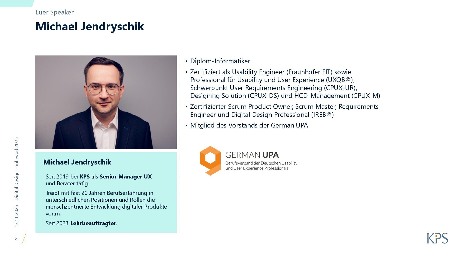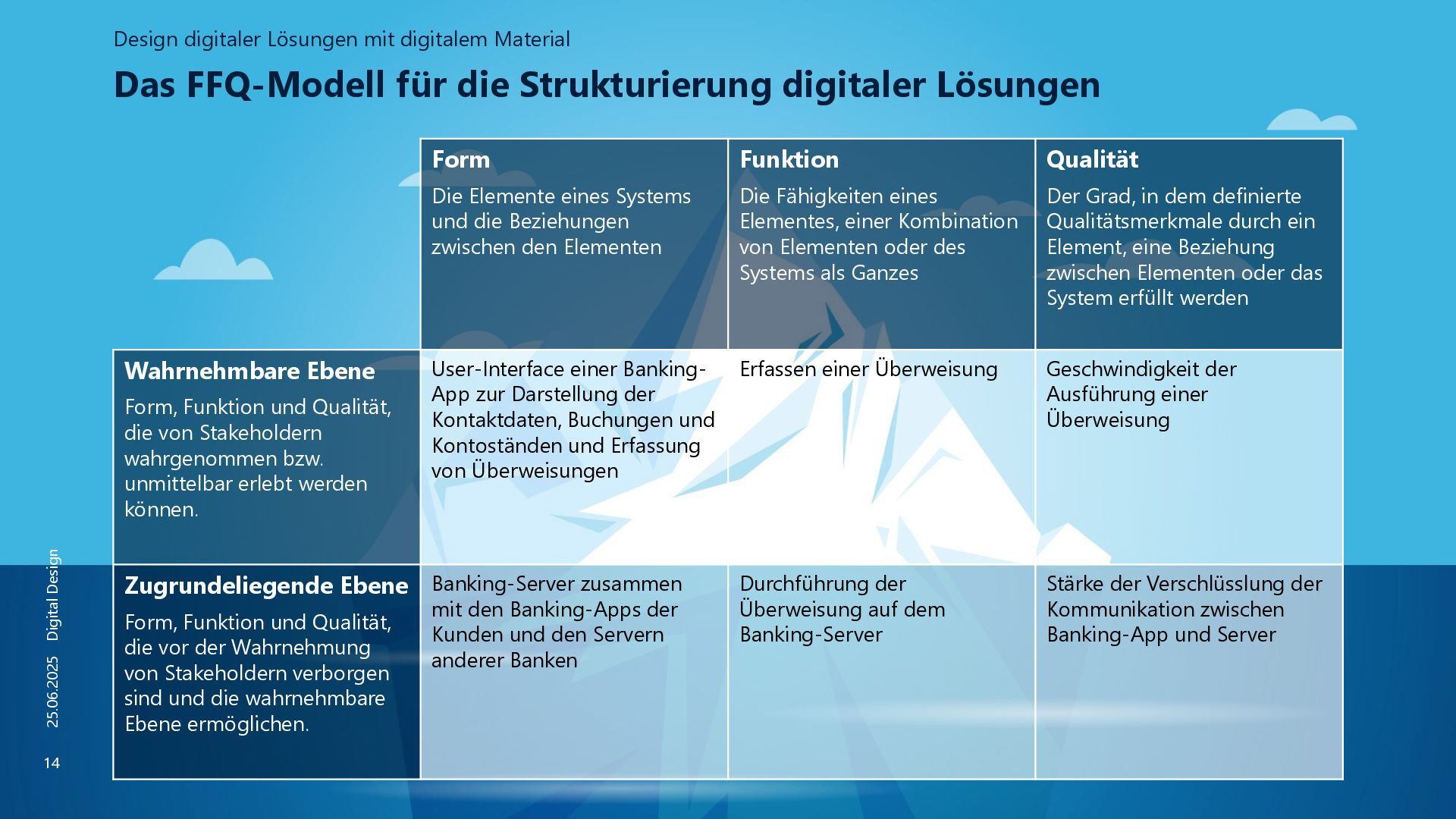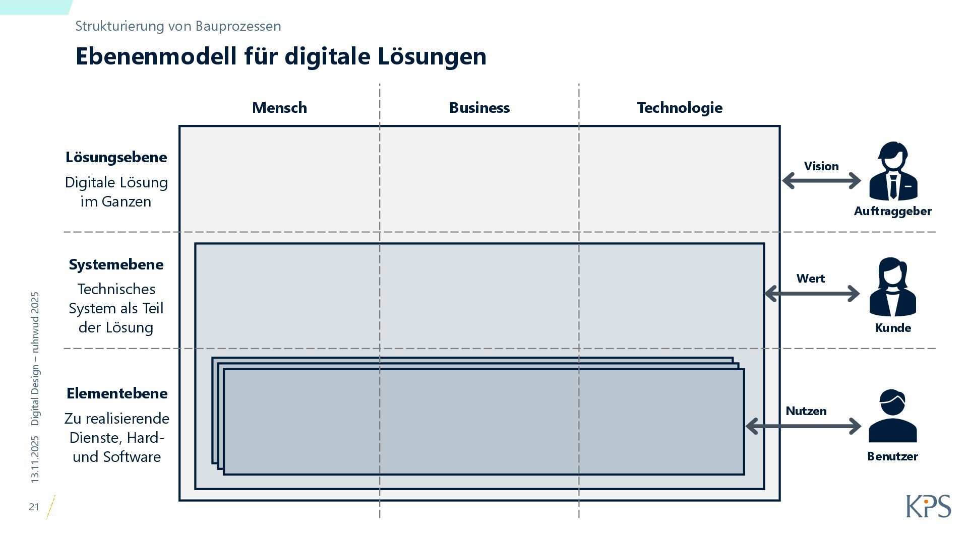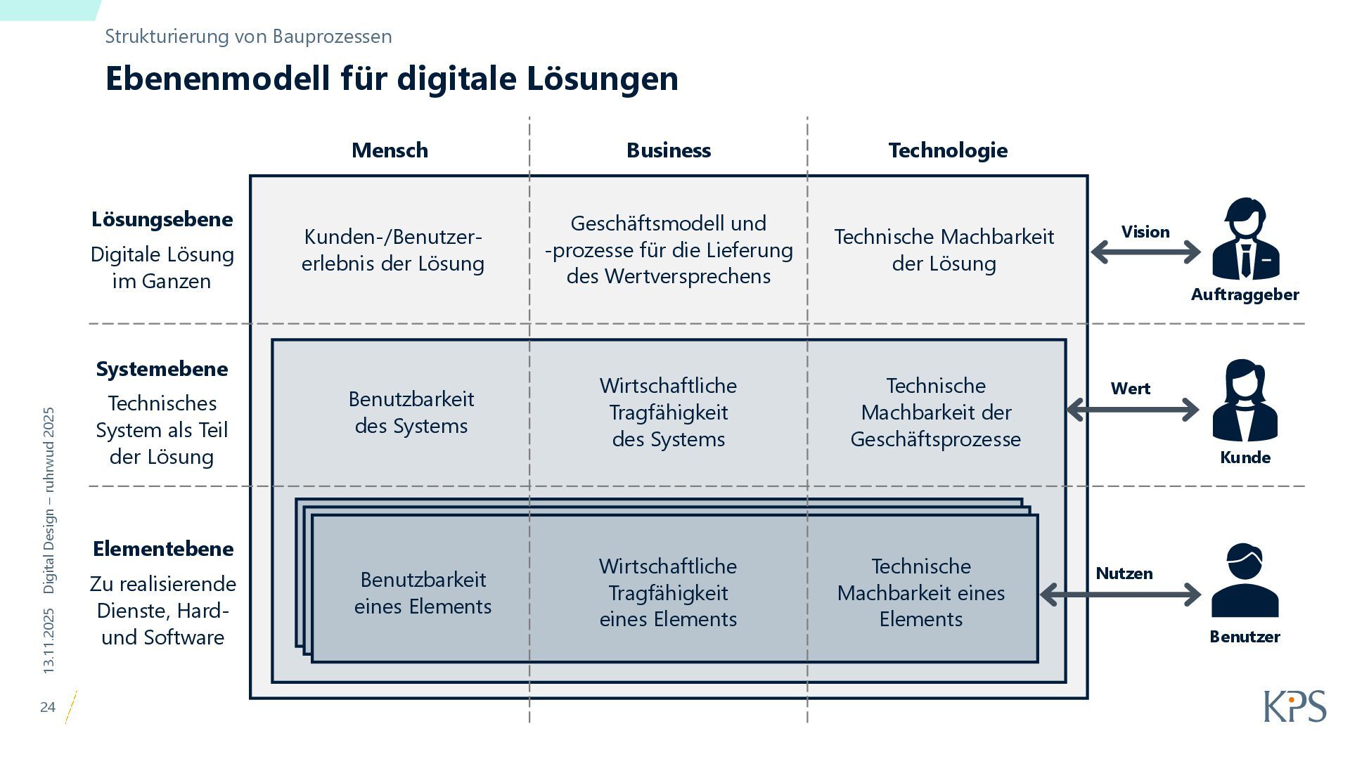 Digital Design bietet einen umfassenden Ansatz zur Gestaltung digitaler Lösungen, der Mensch, Business und Technologie ganzheitlich vereint. Analog zu Architektur oder Industriedesign etabliert sich Digital Design als eigenständiges Berufsbild mit dem Fokus, erfolgreiche digitale Lösungen zu gestalten. Doch was genau ist „Digital Design“? Dieser Vortrag beantwortet die Frage anhand des Digital Design Professional Curriculums und stellt zentrale Modelle und Prinzipien vor, wie das FFQ-Modell, die drei Designperspektiven, die drei Ebenen einer Lösung sowie Schritte, Tätigkeitsbereiche und Arbeitsprodukte im Bauprozess.