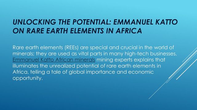 Rare earth elements (REEs) are special and crucial in the world of minerals; they are used as vital parts in many high-tech businesses. Emmanuel Katto African minerals mining experts explains that illuminates the unrealized potential of rare earth elements in Africa, telling a tale of global importance and economic opportunity.