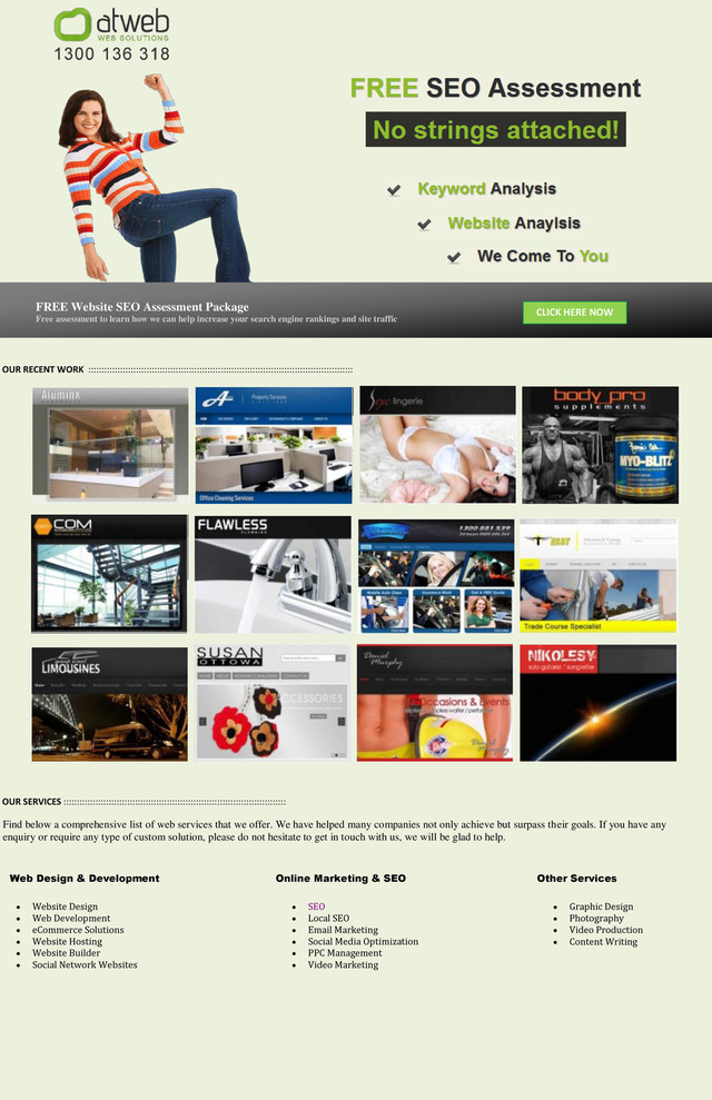 comprehensive list of web services that we offer. We have helped many companies not only achieve but surpass their goals. If you have any enquiry or require any type of custom solution, please do not hesitate to get in touch with us, we will be glad to help. Web Design & Development Online Marketing & SEO Other Services Website Design Web Development eCommerce Solutions Website Hosting Website Builder Social Network Websites SEO Local SEO Email Marketing Social Media Optimization PPC Management Video Marketing Graphic Design Photography Video Production Content Writing FREE Website SEO Assessment Package Free assessment to learn how we can help increase your search engine rankings and site traffic CLICK HERE NOW
