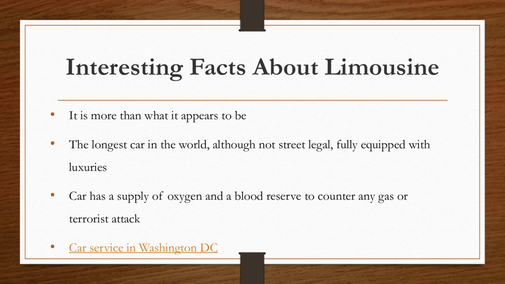 it appears to be • The longest car in the world, although not street legal, fully equipped with luxuries • Car has a supply of oxygen and a blood reserve to counter any gas or terrorist attack • Car service in Washington DC