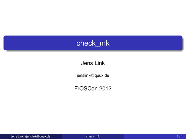 sich zusammen aus Network und Hagios (gr: heilig) flexibel, skalierbar, erweiterbar durch Plugin Architektur Überwachen läßt sich alles (zu einem bestimmten Grad) was im Netz erreichbar ist Entwicklung scheint zu Gunsten der kommerziellen Variante eingschlafen zu sein :-( Jens Link ([email protected]) check_mk 3 / 1