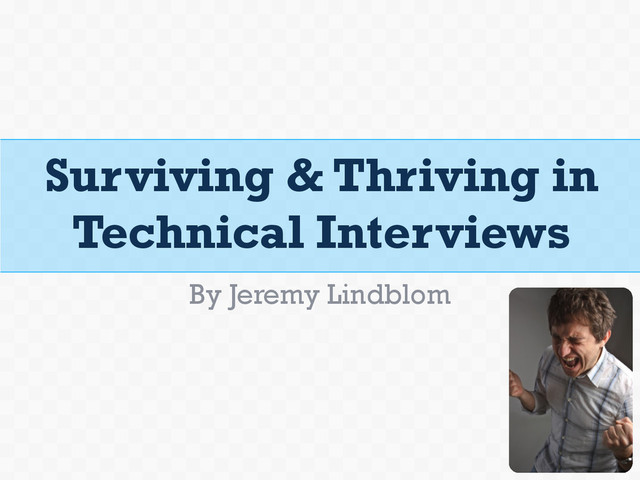 Technical interviews can a difficult and stressful part of finding employment. Regardless of whether or not you receive the job offer, you can make the technical interview process a good experience every time. In this session, you will learn some tips for your next technical interview, and also analyze some example interview and coding questions to learn how to think about and answer questions in a way that shows off your abilities.