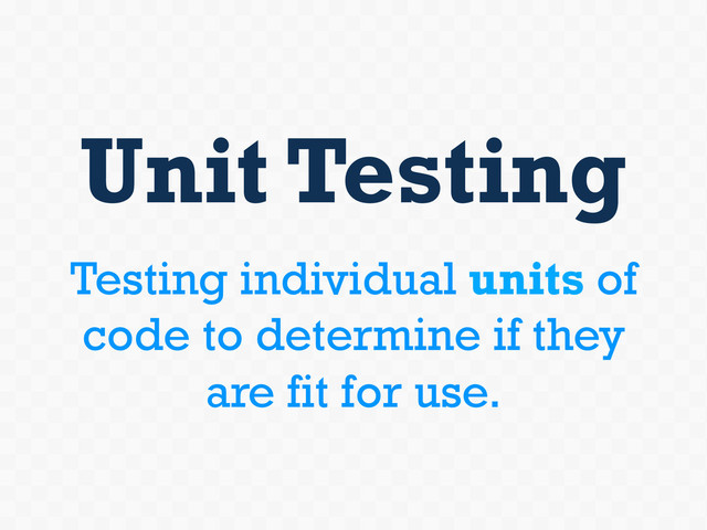 and well documented • Installable via Composer, PEAR, and Phar Features: • Mocking • Assertions • Setup/teardown • Annotations • Data providers • Code coverage • Selenium integration • Etc.