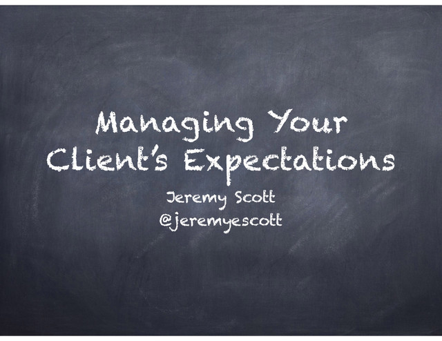 Managing client expectations. 9 thoughts to help get you and your client on the same page and keep it that way. Look for it on Wordpress.tv (one day) and hit me up on Twitter @jeremyescott.