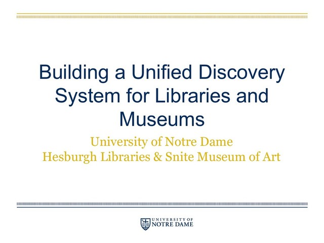 The Hesburgh Libraries and Snite Museum of Art at the University of Notre Dame have embarked on a three-year project funded by the Andrew W. Mellon Foundation to create a unified platform for the discovery of digitized collections. This session will underscore the importance of GLAM collaboration and explore how the development of this open source software will facilitate publication of institutional collections online. For institutions interested in providing unified discovery across multiple databases, or institutions looking to publish collections online, this session will cover the project overview, the challenges in mapping disparate library and museum data together, and the progress made during our first year and a half.
