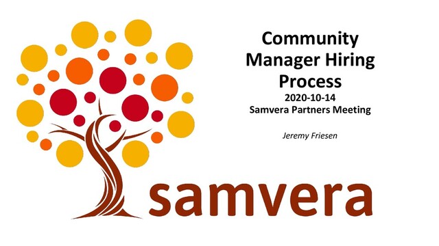 Skills, and Abilities • Organized • Effective communicator • Collaborative • Administrative skills • Experience with distributed teams, open communities, LAM*, open source processes • Familiarity with Samvera • Ability to grow the community Further details: https://wiki.lyrasis.org/display/samvera/Community+Manager+Search+Committee * LAM - Library, Archives, Museums
