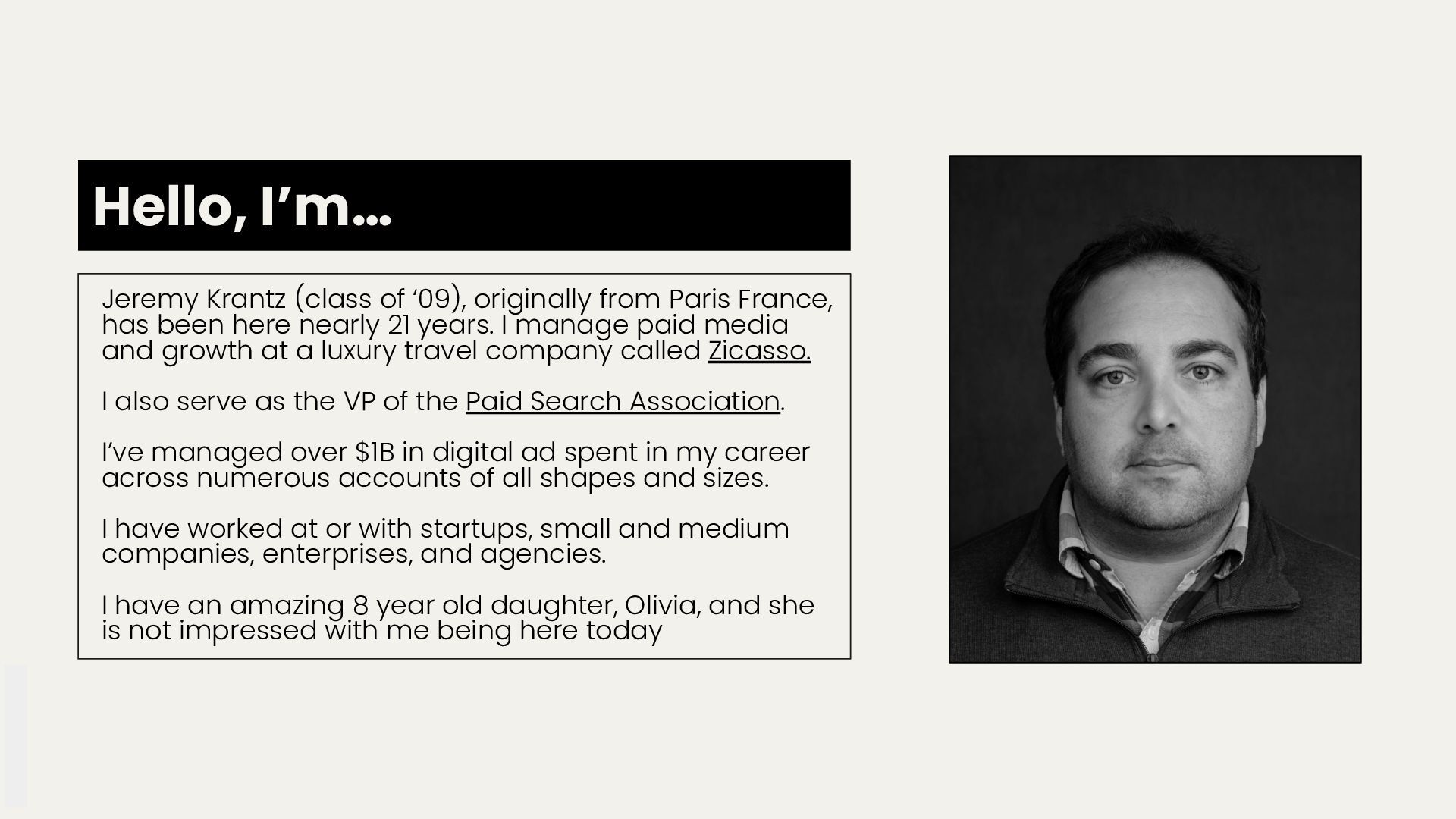 France, has been here nearly 21 years. I manage paid media and growth at a luxury travel company called Zicasso. I also serve as the VP of the Paid Search Association. I’ve managed over $1B in digital ad spent in my career across numerous accounts of all shapes and sizes. I have worked at or with startups, small and medium companies, enterprises, and agencies. I have an amazing 8 year old daughter, Olivia, and she is not impressed with me being here today