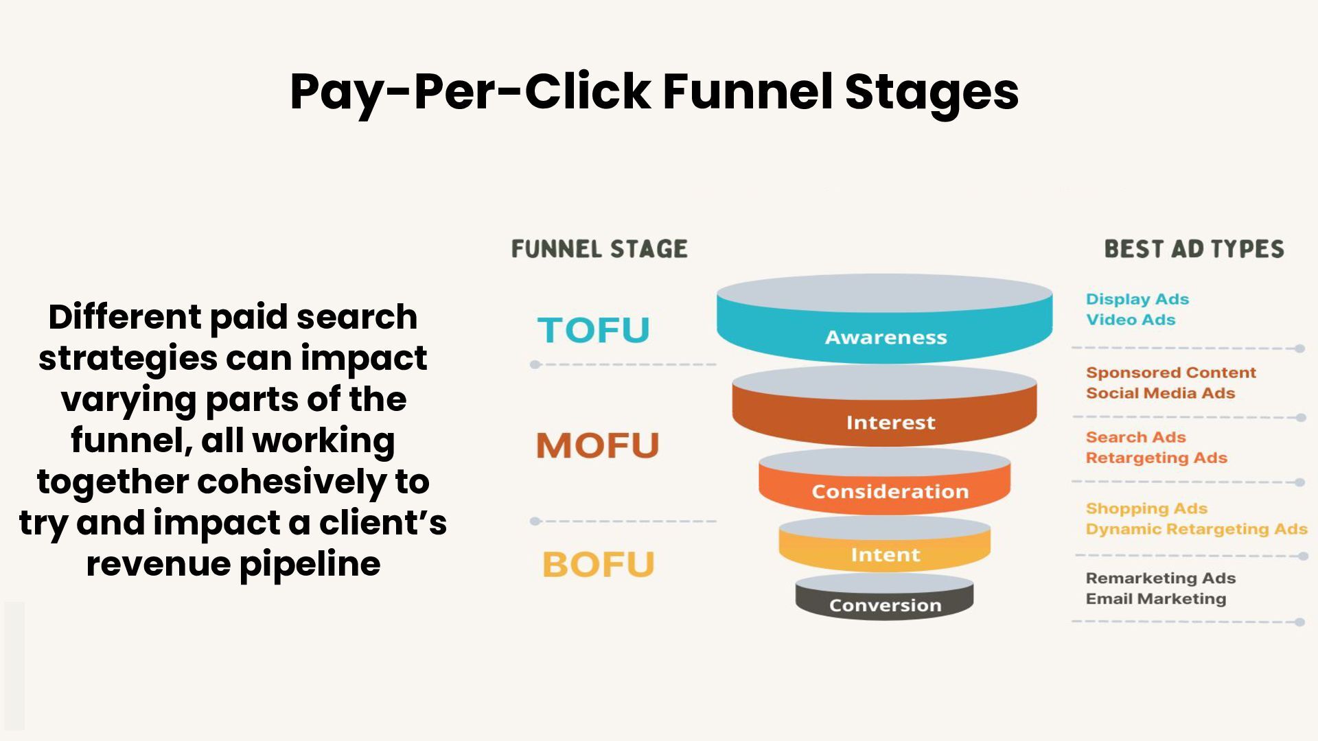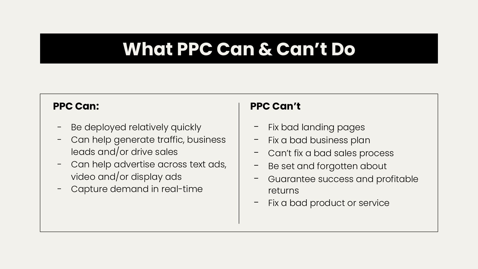 bad landing pages - Fix a bad business plan - Can’t fix a bad sales process - Be set and forgotten about - Guarantee success and profitable returns - Fix a bad product or service PPC Can: - Be deployed relatively quickly - Can help generate traffic, business leads and/or drive sales - Can help advertise across text ads, video and/or display ads - Capture demand in real-time