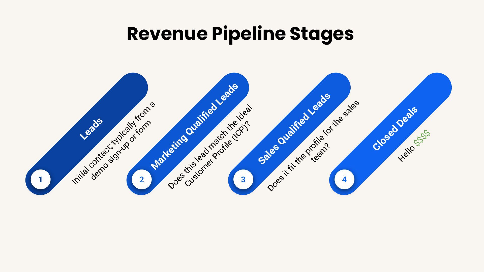dem o sign-up or form 2 M arketing Qualified Leads Does this lead m atch the Ideal Custom er Profile (ICP)? 3 Sales Qualified Leads Does it fit the profile for the sales team ? 4 Closed Deals H ello $$$$