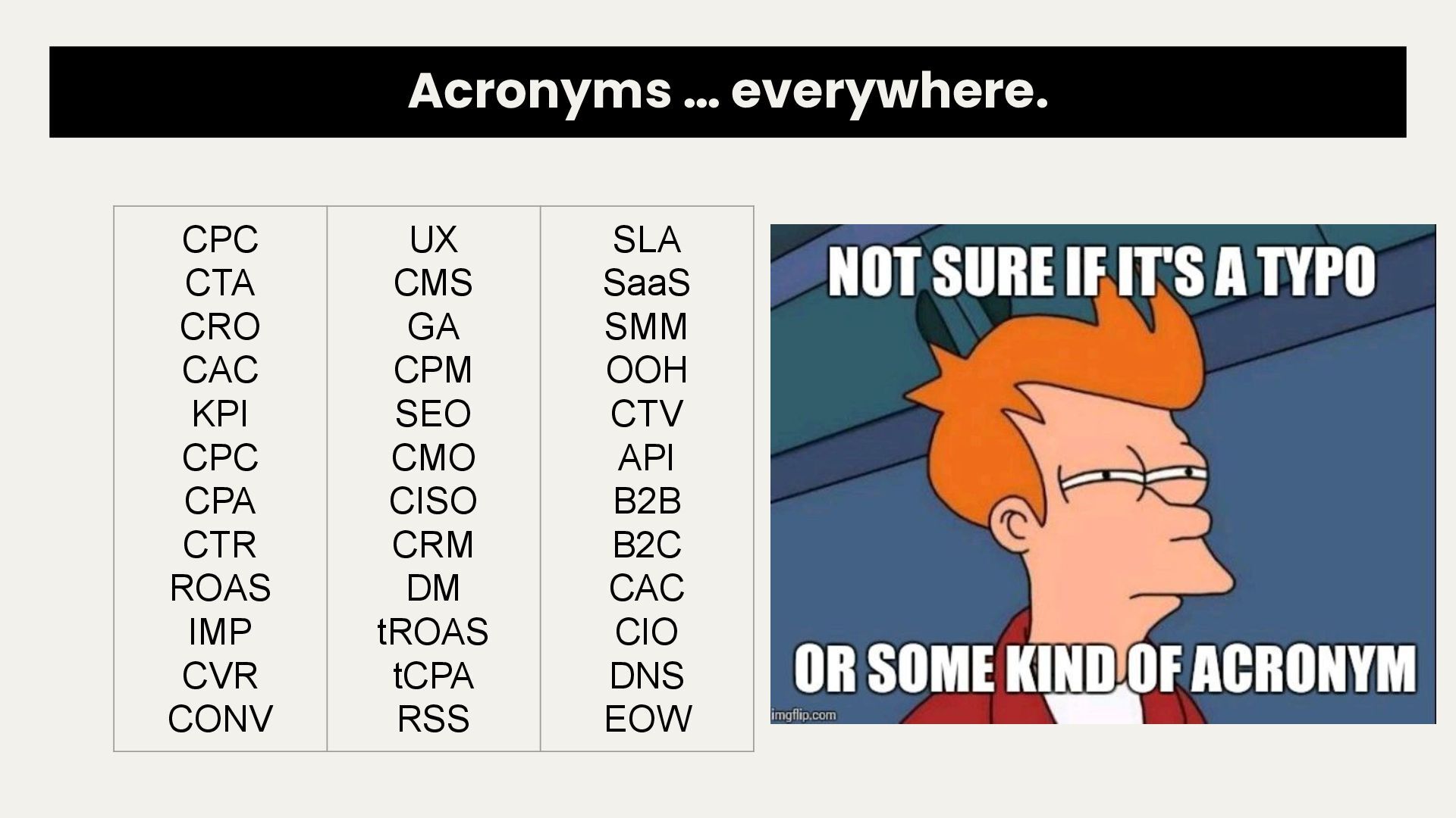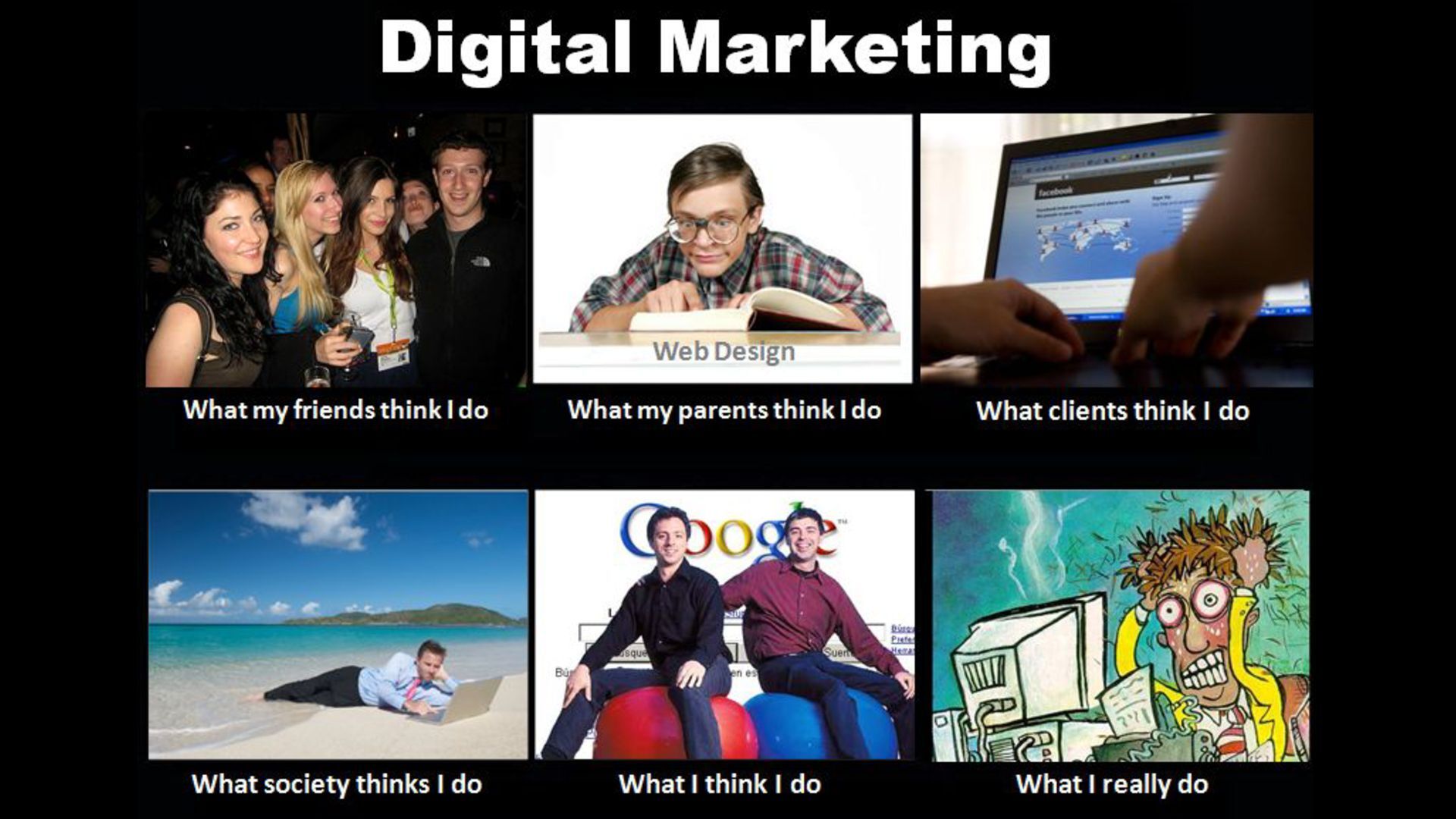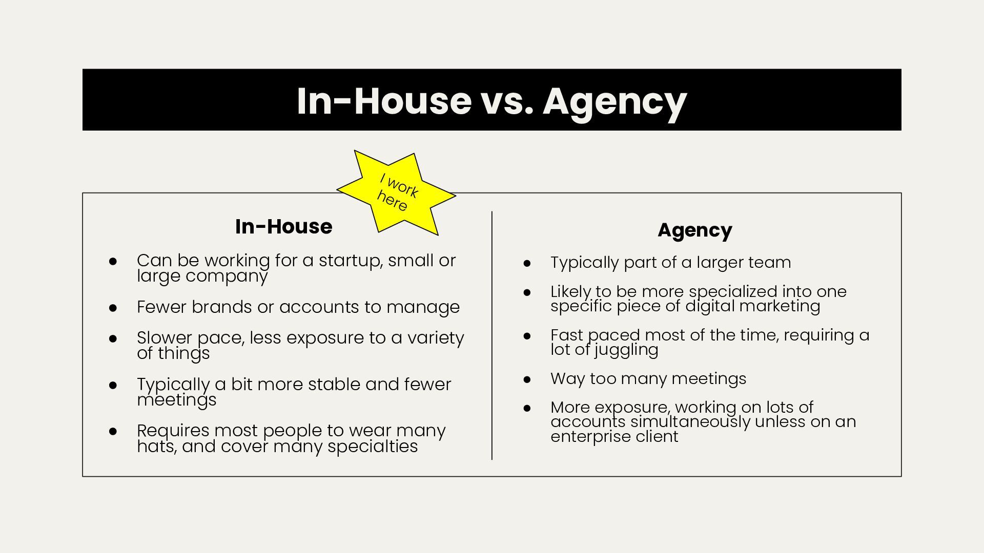 startup, small or large company • Fewer brands or accounts to manage • Slower pace, less exposure to a variety of things • Typically a bit more stable and fewer meetings • Requires most people to wear many hats, and cover many specialties Agency • Typically part of a larger team • Likely to be more specialized into one specific piece of digital marketing • Fast paced most of the time, requiring a lot of juggling • Way too many meetings • More exposure, working on lots of accounts simultaneously unless on an enterprise client I work here