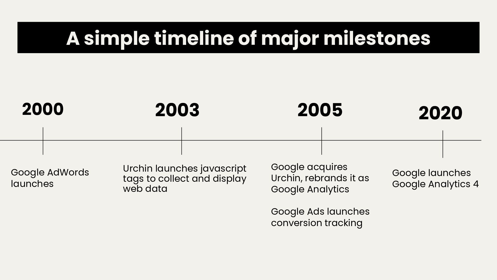 AdWords launches Google acquires Urchin, rebrands it as Google Analytics Google Ads launches conversion tracking Urchin launches javascript tags to collect and display web data 2020 Google launches Google Analytics 4