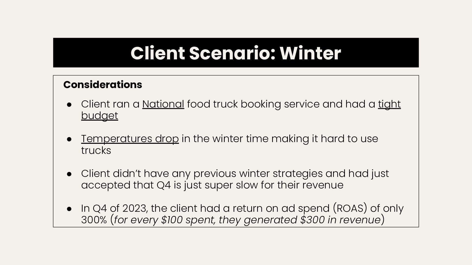 truck booking service and had a tight budget • Temperatures drop in the winter time making it hard to use trucks • Client didn’t have any previous winter strategies and had just accepted that Q4 is just super slow for their revenue • In Q4 of 2023, the client had a return on ad spend (ROAS) of only 300% (for every $100 spent, they generated $300 in revenue)