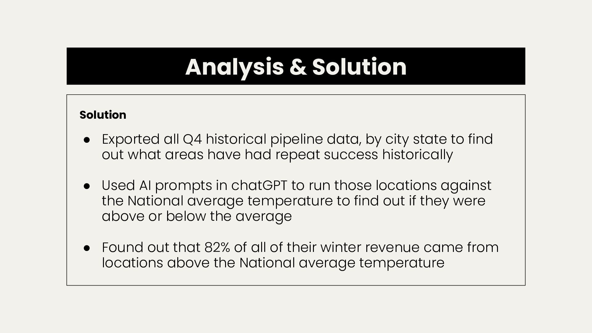 data, by city state to find out what areas have had repeat success historically • Used AI prompts in chatGPT to run those locations against the National average temperature to find out if they were above or below the average • Found out that 82% of all of their winter revenue came from locations above the National average temperature