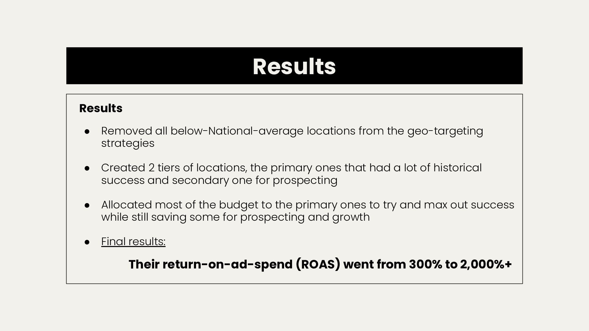 strategies • Created 2 tiers of locations, the primary ones that had a lot of historical success and secondary one for prospecting • Allocated most of the budget to the primary ones to try and max out success while still saving some for prospecting and growth • Final results: Their return-on-ad-spend (ROAS) went from 300% to 2,000%+