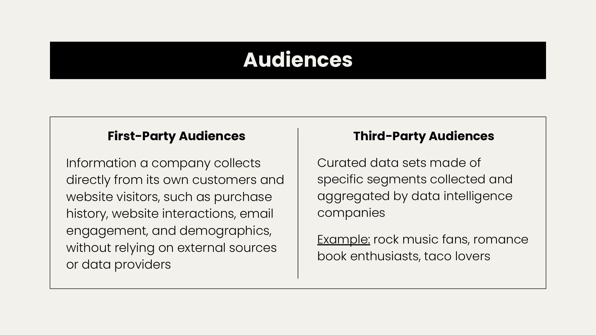 own customers and website visitors, such as purchase history, website interactions, email engagement, and demographics, without relying on external sources or data providers Third-Party Audiences Curated data sets made of specific segments collected and aggregated by data intelligence companies Example: rock music fans, romance book enthusiasts, taco lovers