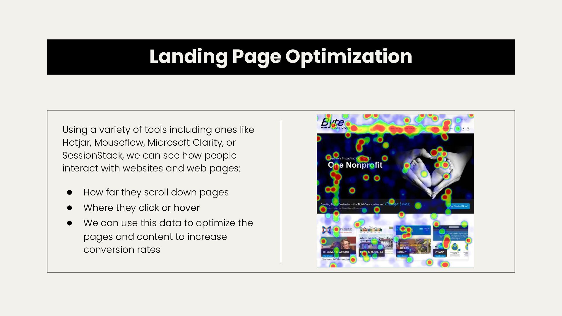 like Hotjar, Mouseflow, Microsoft Clarity, or SessionStack, we can see how people interact with websites and web pages: • How far they scroll down pages • Where they click or hover • We can use this data to optimize the pages and content to increase conversion rates