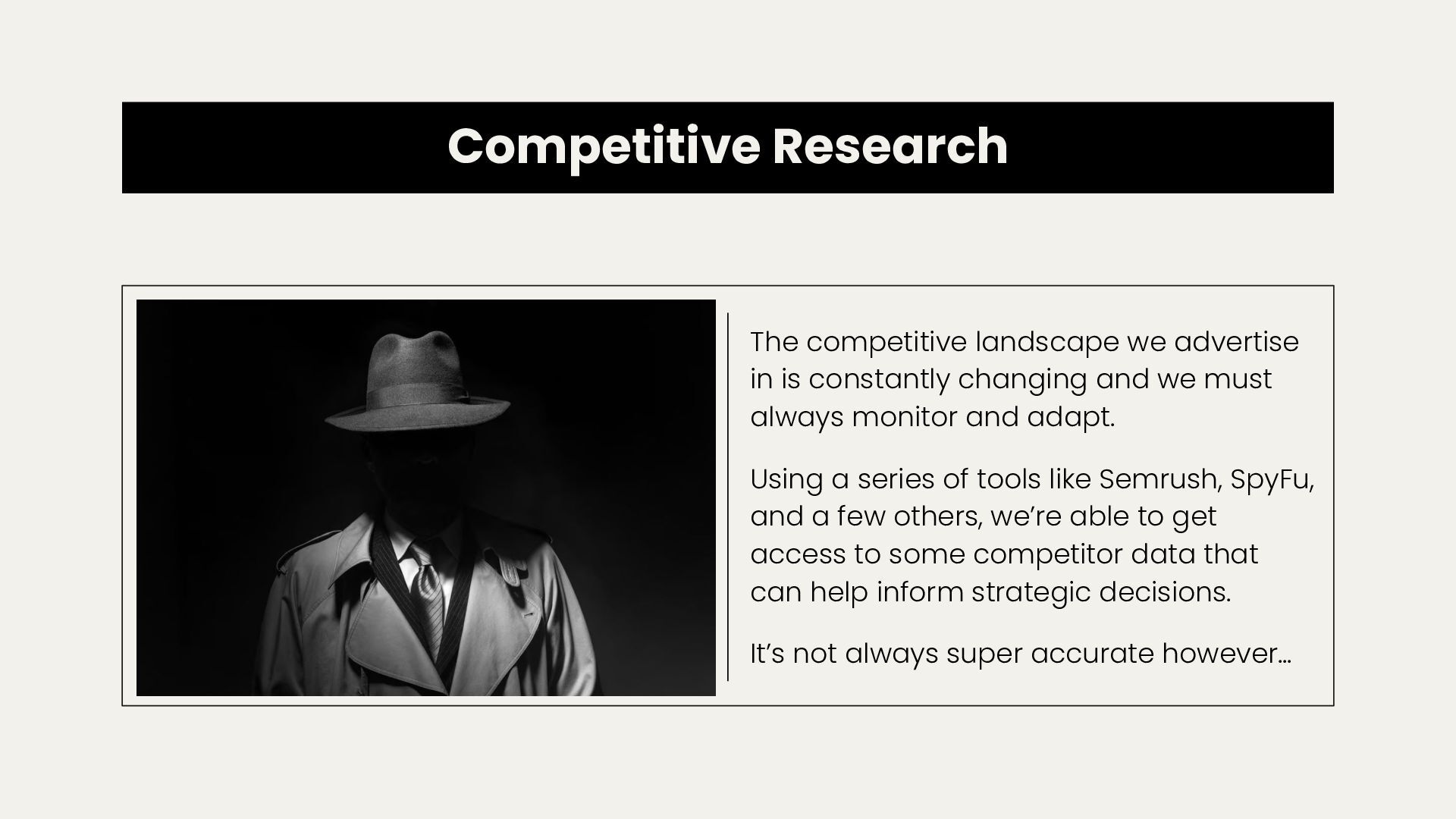 changing and we must always monitor and adapt. Using a series of tools like Semrush, SpyFu, and a few others, we’re able to get access to some competitor data that can help inform strategic decisions. It’s not always super accurate however…