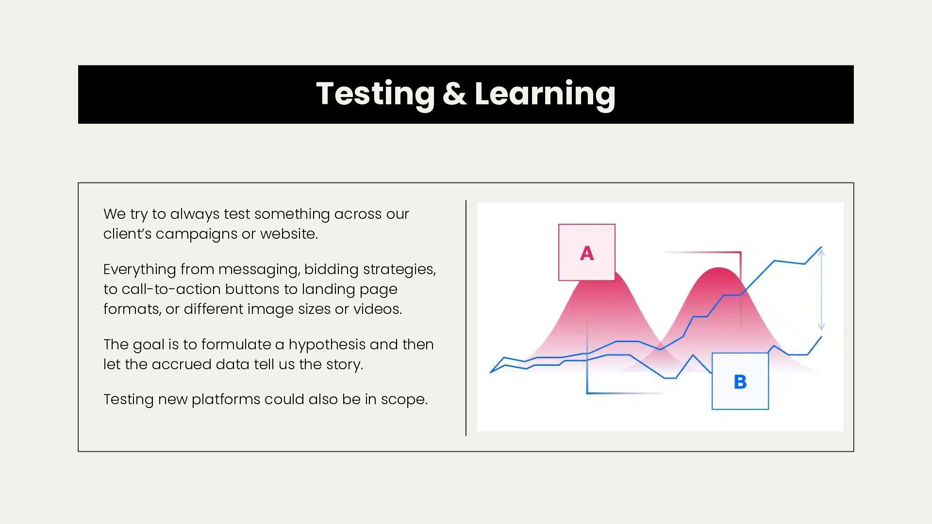 our client’s campaigns or website. Everything from messaging, bidding strategies, to call-to-action buttons to landing page formats, or different image sizes or videos. The goal is to formulate a hypothesis and then let the accrued data tell us the story. Testing new platforms could also be in scope.