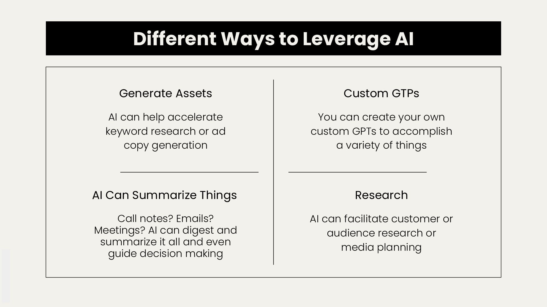 accelerate keyword research or ad copy generation Custom GTPs You can create your own custom GPTs to accomplish a variety of things AI Can Summarize Things Call notes? Emails? Meetings? AI can digest and summarize it all and even guide decision making AI can facilitate customer or audience research or media planning Research