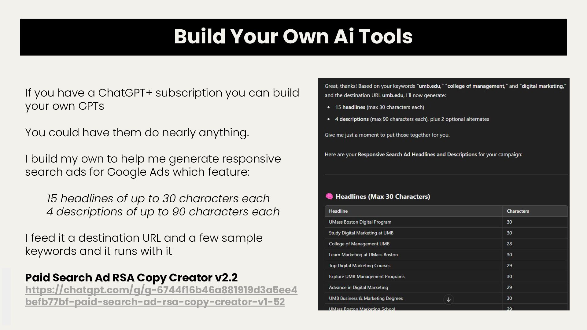 subscription you can build your own GPTs You could have them do nearly anything. I build my own to help me generate responsive search ads for Google Ads which feature: 15 headlines of up to 30 characters each 4 descriptions of up to 90 characters each I feed it a destination URL and a few sample keywords and it runs with it Paid Search Ad RSA Copy Creator v2.2 https://chatgpt.com/g/g-6744f16b46a881919d3a5ee4 befb77bf-paid-search-ad-rsa-copy-creator-v1-52