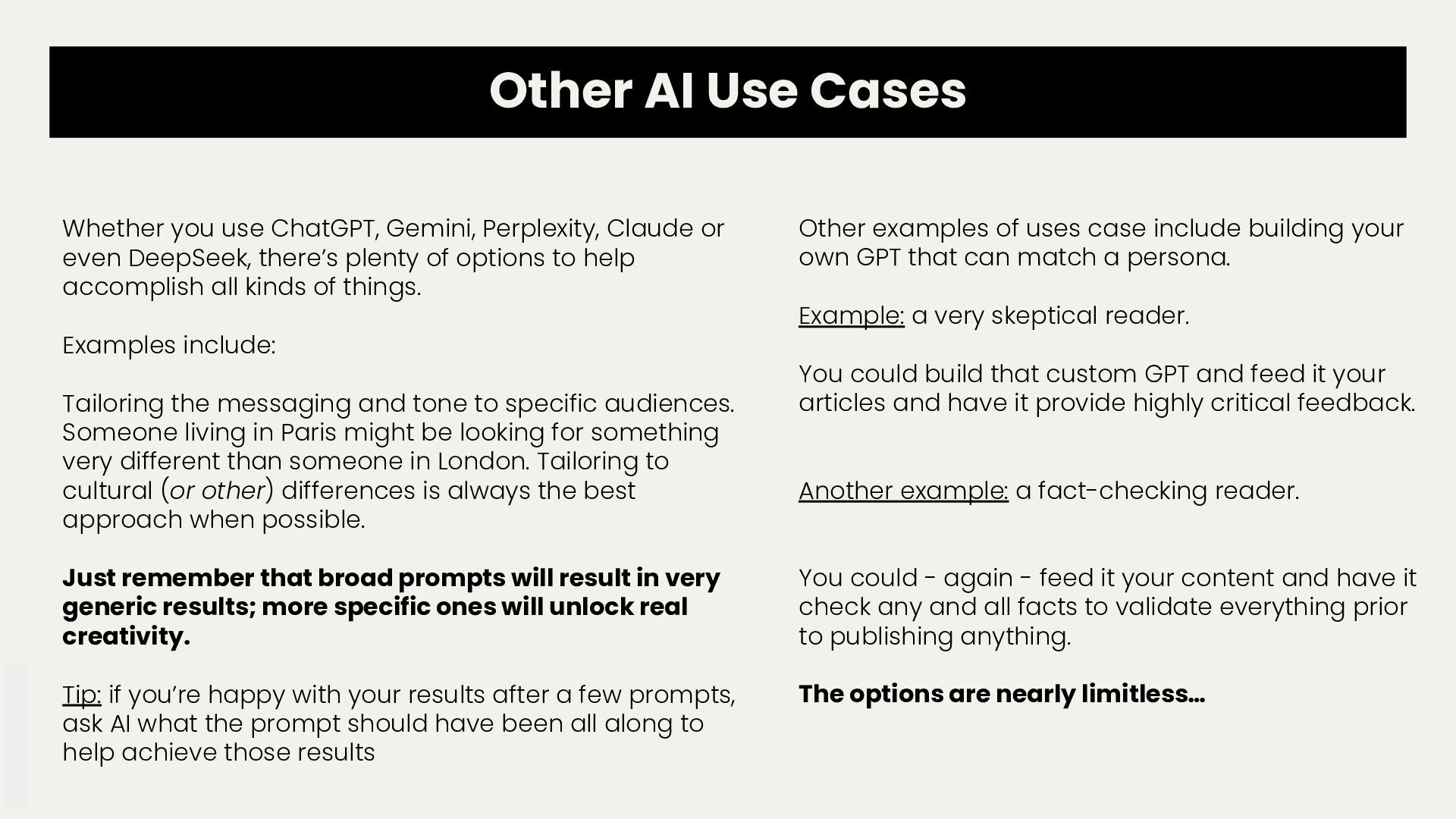 Claude or even DeepSeek, there’s plenty of options to help accomplish all kinds of things. Examples include: Tailoring the messaging and tone to specific audiences. Someone living in Paris might be looking for something very different than someone in London. Tailoring to cultural (or other) differences is always the best approach when possible. Just remember that broad prompts will result in very generic results; more specific ones will unlock real creativity. Tip: if you’re happy with your results after a few prompts, ask AI what the prompt should have been all along to help achieve those results Other examples of uses case include building your own GPT that can match a persona. Example: a very skeptical reader. You could build that custom GPT and feed it your articles and have it provide highly critical feedback. Another example: a fact-checking reader. You could - again - feed it your content and have it check any and all facts to validate everything prior to publishing anything. The options are nearly limitless…