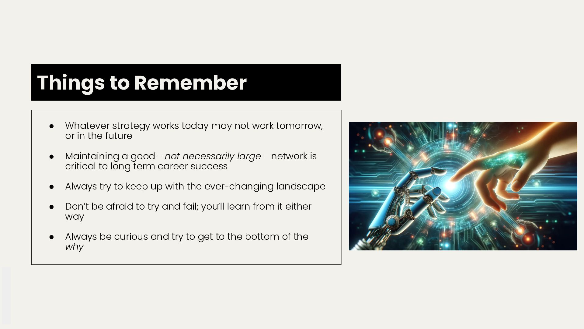 work tomorrow, or in the future • Maintaining a good - not necessarily large - network is critical to long term career success • Always try to keep up with the ever-changing landscape • Don’t be afraid to try and fail; you’ll learn from it either way • Always be curious and try to get to the bottom of the why