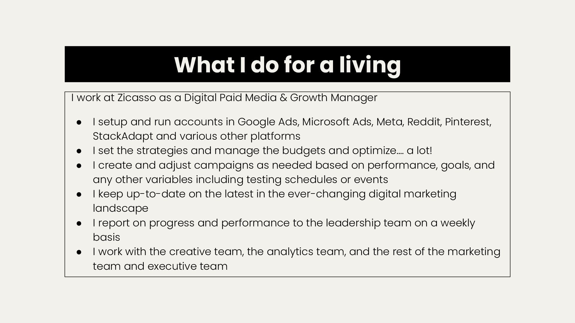 as a Digital Paid Media & Growth Manager • I setup and run accounts in Google Ads, Microsoft Ads, Meta, Reddit, Pinterest, StackAdapt and various other platforms • I set the strategies and manage the budgets and optimize…. a lot! • I create and adjust campaigns as needed based on performance, goals, and any other variables including testing schedules or events • I keep up-to-date on the latest in the ever-changing digital marketing landscape • I report on progress and performance to the leadership team on a weekly basis • I work with the creative team, the analytics team, and the rest of the marketing team and executive team
