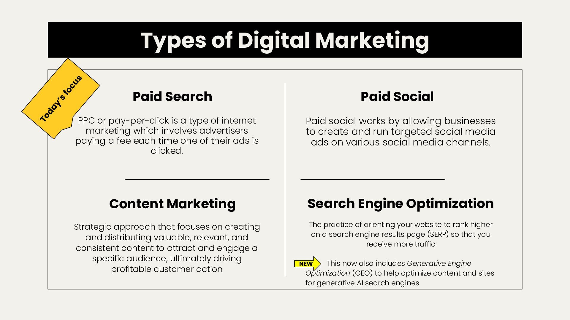a type of internet marketing which involves advertisers paying a fee each time one of their ads is clicked. Paid Social Paid social works by allowing businesses to create and run targeted social media ads on various social media channels. Content Marketing Strategic approach that focuses on creating and distributing valuable, relevant, and consistent content to attract and engage a specific audience, ultimately driving profitable customer action The practice of orienting your website to rank higher on a search engine results page (SERP) so that you receive more traffic This now also includes Generative Engine Optimization (GEO) to help optimize content and sites for generative AI search engines Search Engine Optimization Today’s focus NEW