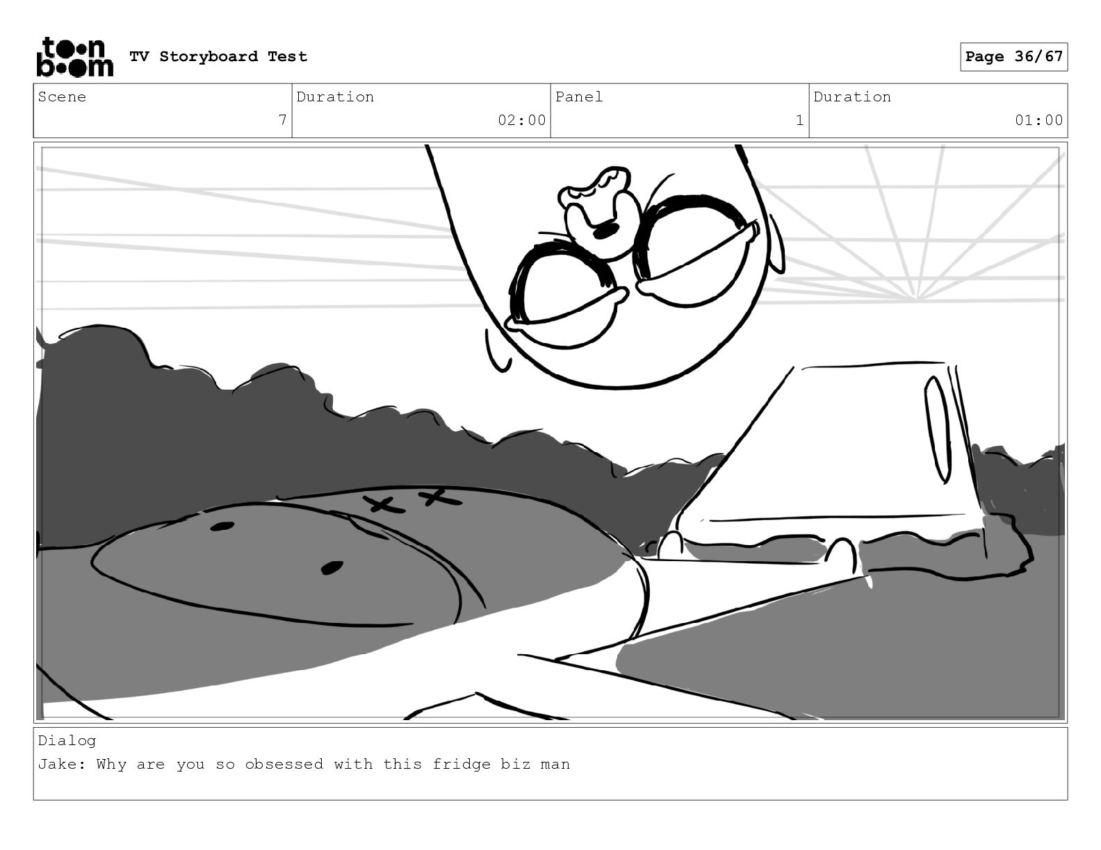 Scene 7 Duration 02:00 Panel 1 Duration 01:00 Dialog Jake: