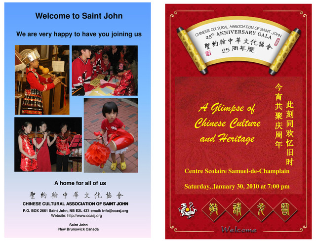 culture 2) To permeate Chinese culture and promote multi- culturalism 3) To promote understanding and goodwill between Chinese Canadians and other ethnic Canadians The Chinese Cultural Association of Saint John A non-profit organization having no affiliation with any religious or political party. The objectives are ~~~ President’s Welcome Message ~~~ Marking a Quarter Century! The Chinese Cultural Association of Saint John has indeed reached this amazing landmark, a 25-year Joyful Journey in our beautiful new homeland. In commemorating and honouring our association‟s rich history, we are proudly presenting to you this Spectacular Chinese Cultural Gala with the theme Fond Memories and Fresh Perspectives. I have been known as a serious University Professor and Scientist for most of my life. Being a President of a Cultural Association was something my Fengsui Masters would never have predicted. When I was approached and asked to volunteer for the Association, I hesitated at first but was convinced by strong support from our community to take on the task as a challenge. You will soon witness the united community spirit and enthusiasm that have gone into the 25th Silver Anniversary Cultural Gala that will charm you tonight. The Gala will feature many talents in our community and around the region to give you a glimpse into our vibrant Chinese Culture and Heritage. Over the past 25 years, the CCASJ has grown into one of the largest ethnic groups in Saint John. We have actively participated in many social and cultural events in the city and province. We are and have truly been recognized as an important part of the Canadian Family. To share our Chinese history and heritage, the Association organizes Chinese language classes and celebrates traditional Chinese Festivals. We are a non-profit organization, with educational charity status, aimed at the promotion of our rich Chinese heritage, a culture of which we are all very proud. Just as important, we aim at enhancing understanding and goodwill between Chinese Canadians and all other Canadians. I would like to acknowledge the groundwork laid down by the CCASJ pioneer founders, support from the community, the local governments, and our sister Associations in the Region. Finally, I want to thank the whole community in joining us in this celebration. Enjoy the show! Prof. Dr. Li-Hong Xu