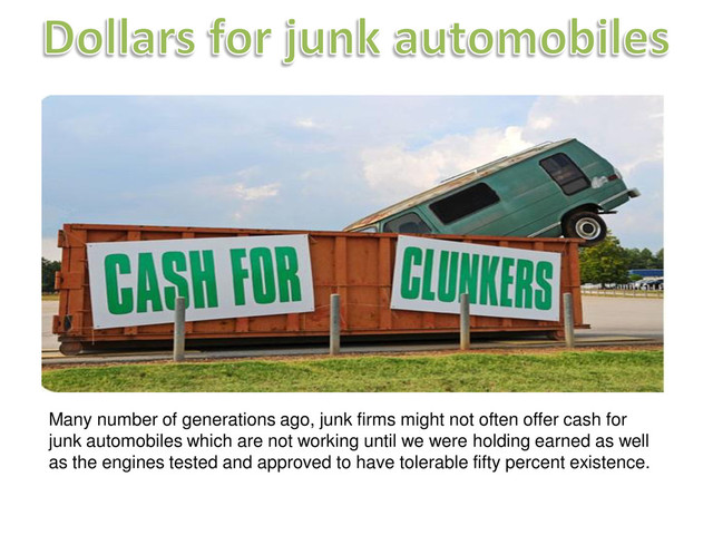 Many number of generations ago, junk firms might not often offer cash for junk automobiles which are not working until we were holding earned as well as the engines tested and approved to have tolerable fifty percent existence.