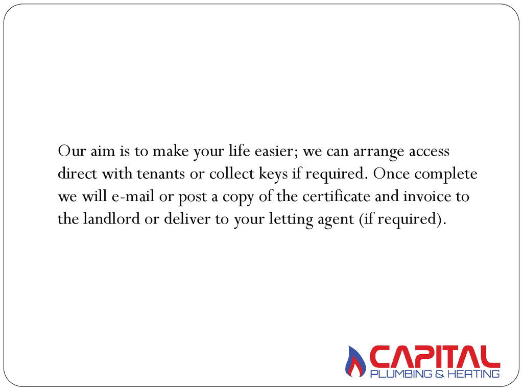 arrange access direct with tenants or collect keys if required. Once complete we will e-mail or post a copy of the certificate and invoice to the landlord or deliver to your letting agent (if required).