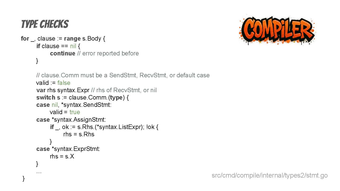 clause == nil { continue // error reported before } // clause.Comm must be a SendStmt, RecvStmt, or default case valid := false var rhs syntax.Expr // rhs of RecvStmt, or nil switch s := clause.Comm.(type) { case nil, *syntax.SendStmt: valid = true case *syntax.AssignStmt: if _, ok := s.Rhs.(*syntax.ListExpr); !ok { rhs = s.Rhs } case *syntax.ExprStmt: rhs = s.X } … } src/cmd/compile/internal/types2/stmt.go