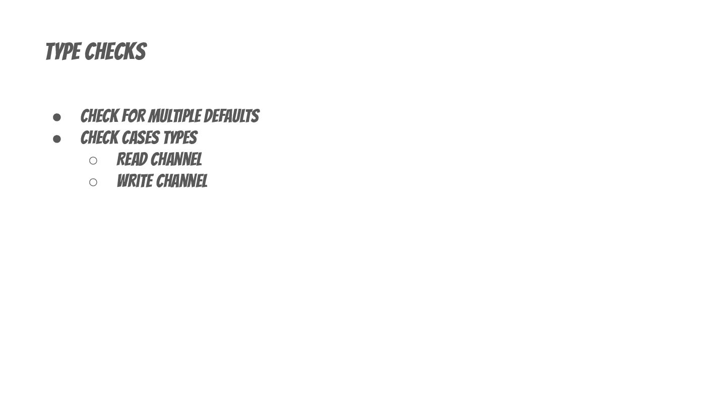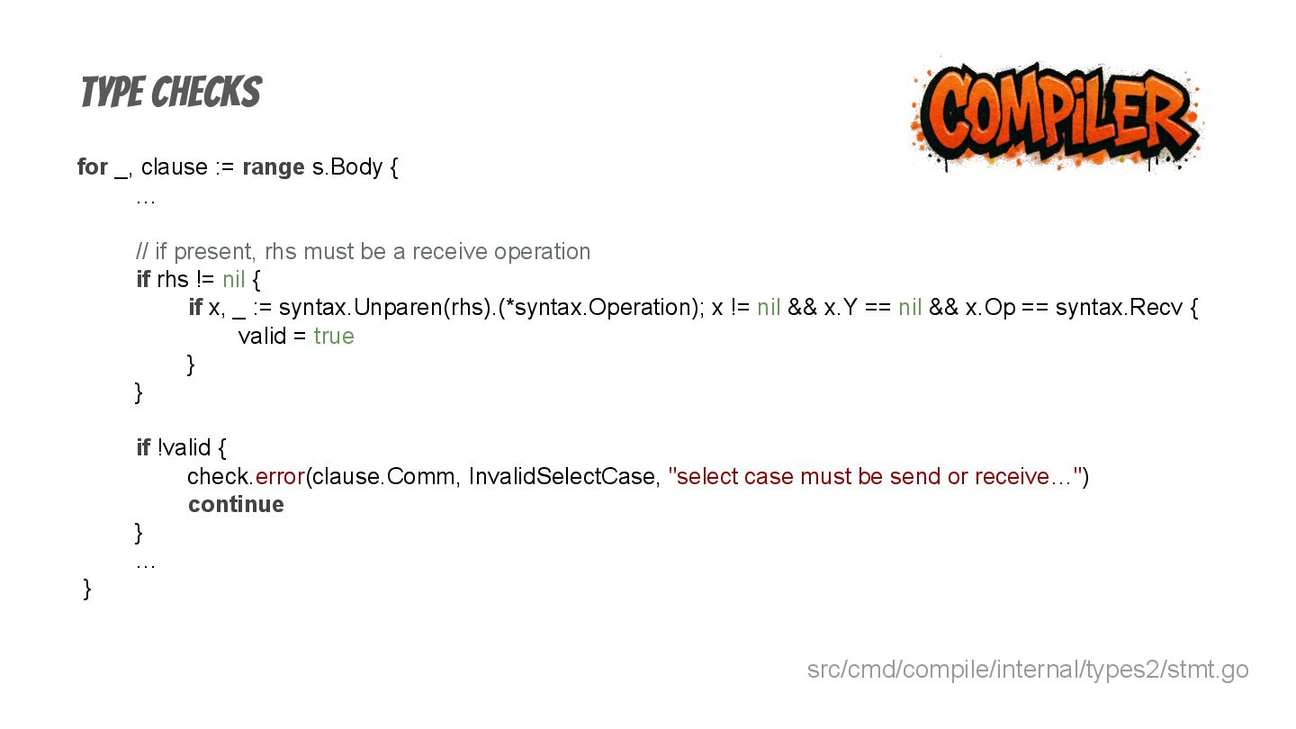 // if present, rhs must be a receive operation if rhs != nil { if x, _ := syntax.Unparen(rhs).(*syntax.Operation); x != nil && x.Y == nil && x.Op == syntax.Recv { valid = true } } if !valid { check.error(clause.Comm, InvalidSelectCase, "select case must be send or receive…") continue } … } src/cmd/compile/internal/types2/stmt.go