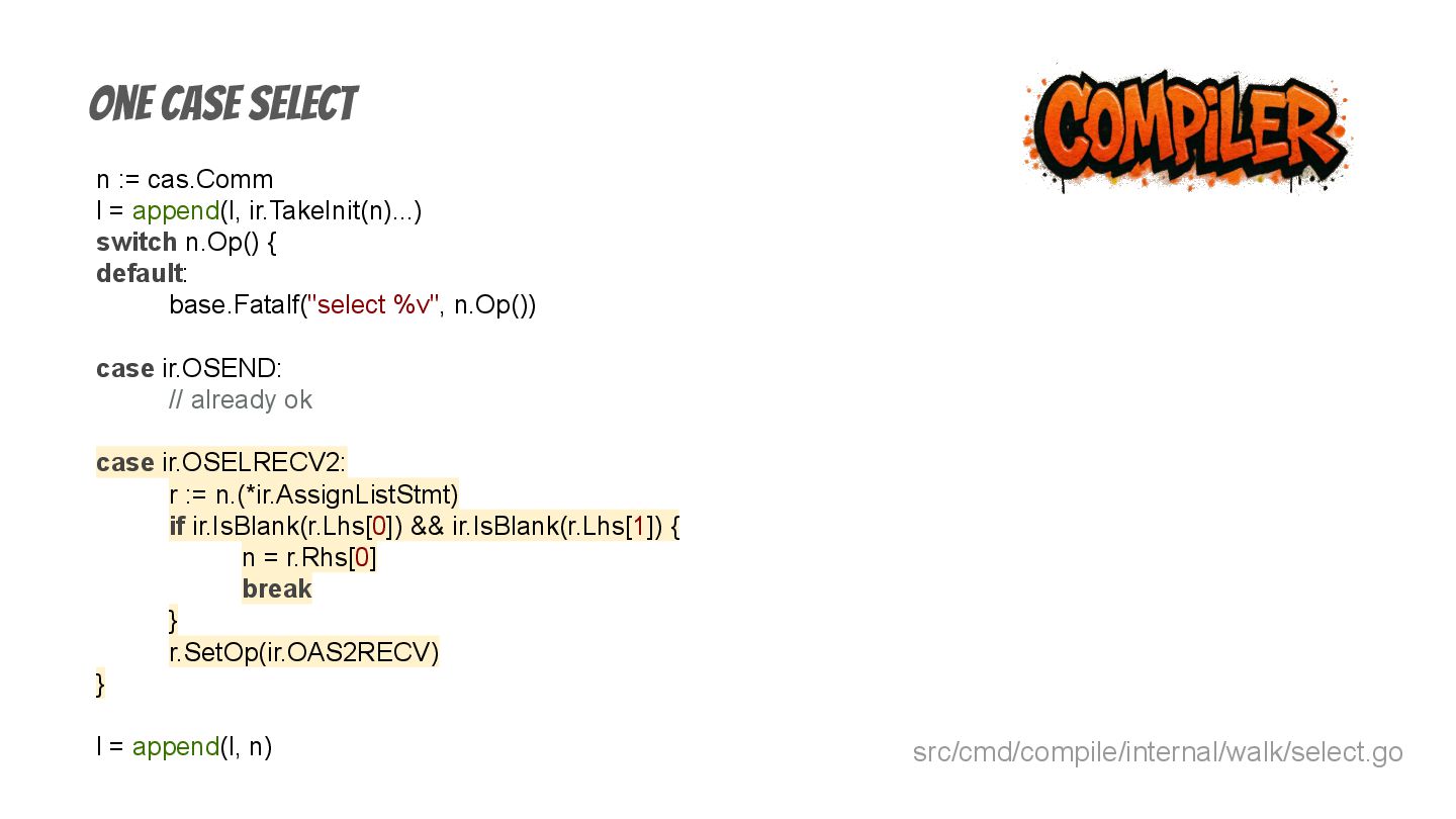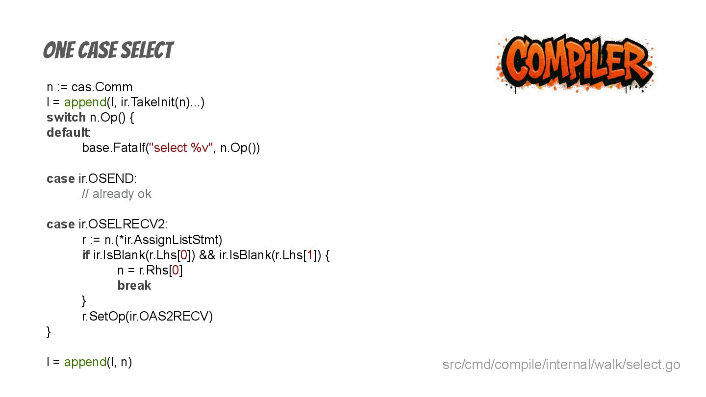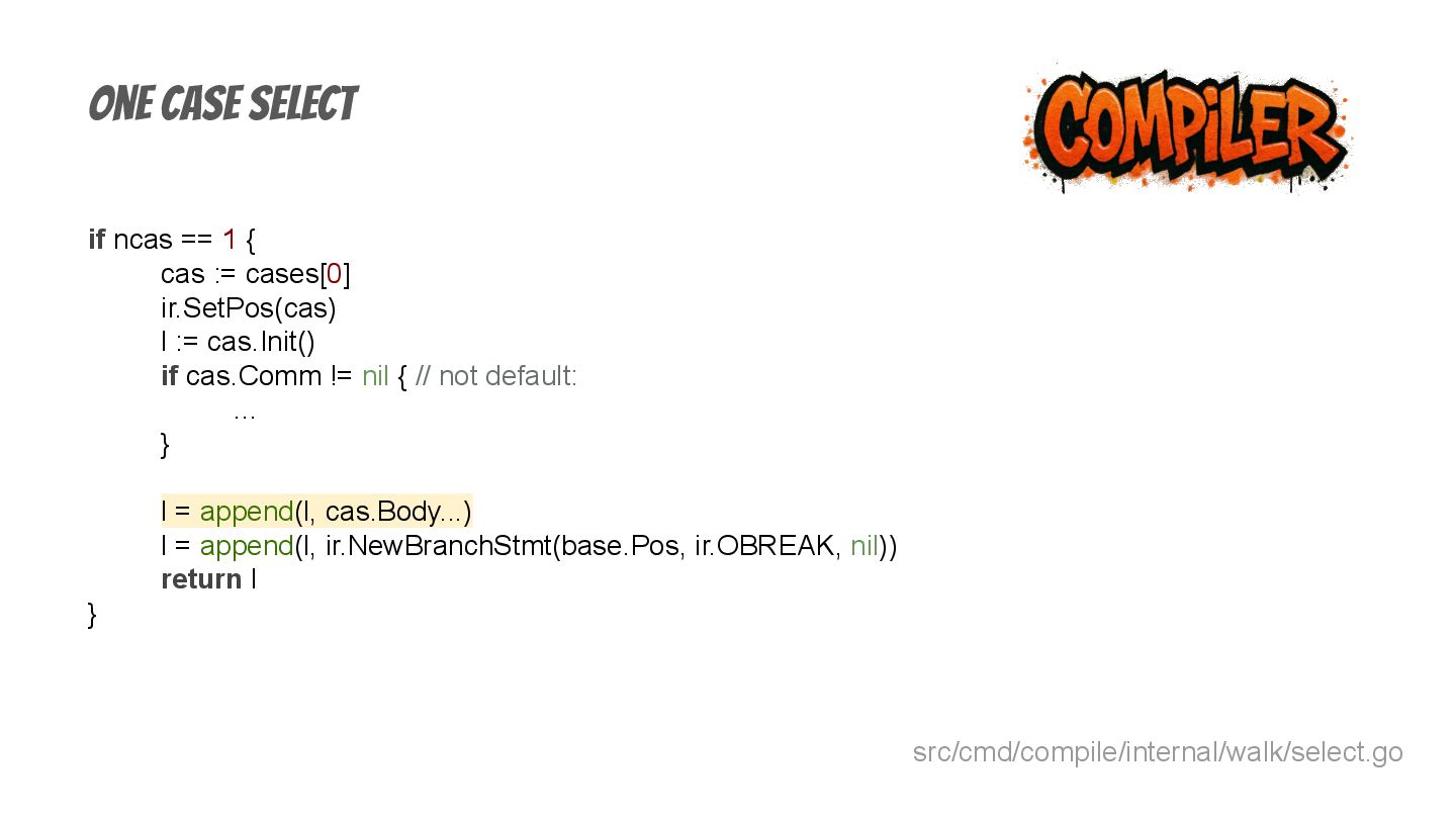 cases[0] ir.SetPos(cas) l := cas.Init() if cas.Comm != nil { // not default: ... } l = append(l, cas.Body...) l = append(l, ir.NewBranchStmt(base.Pos, ir.OBREAK, nil)) return l } src/cmd/compile/internal/walk/select.go