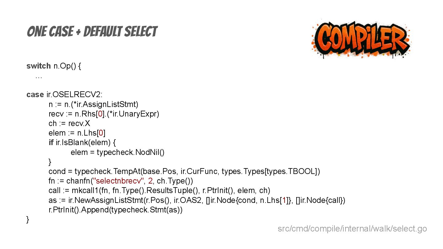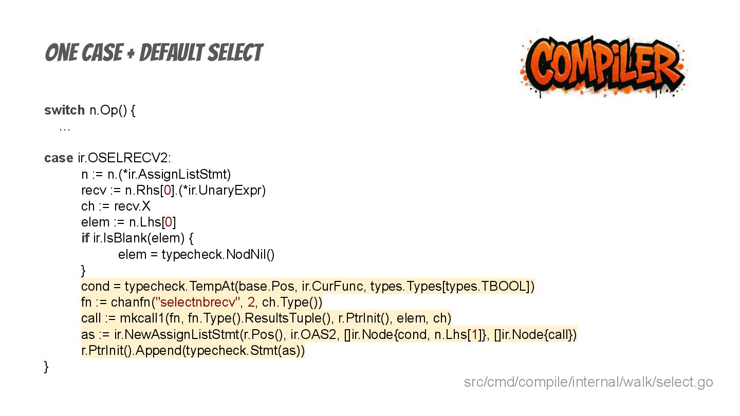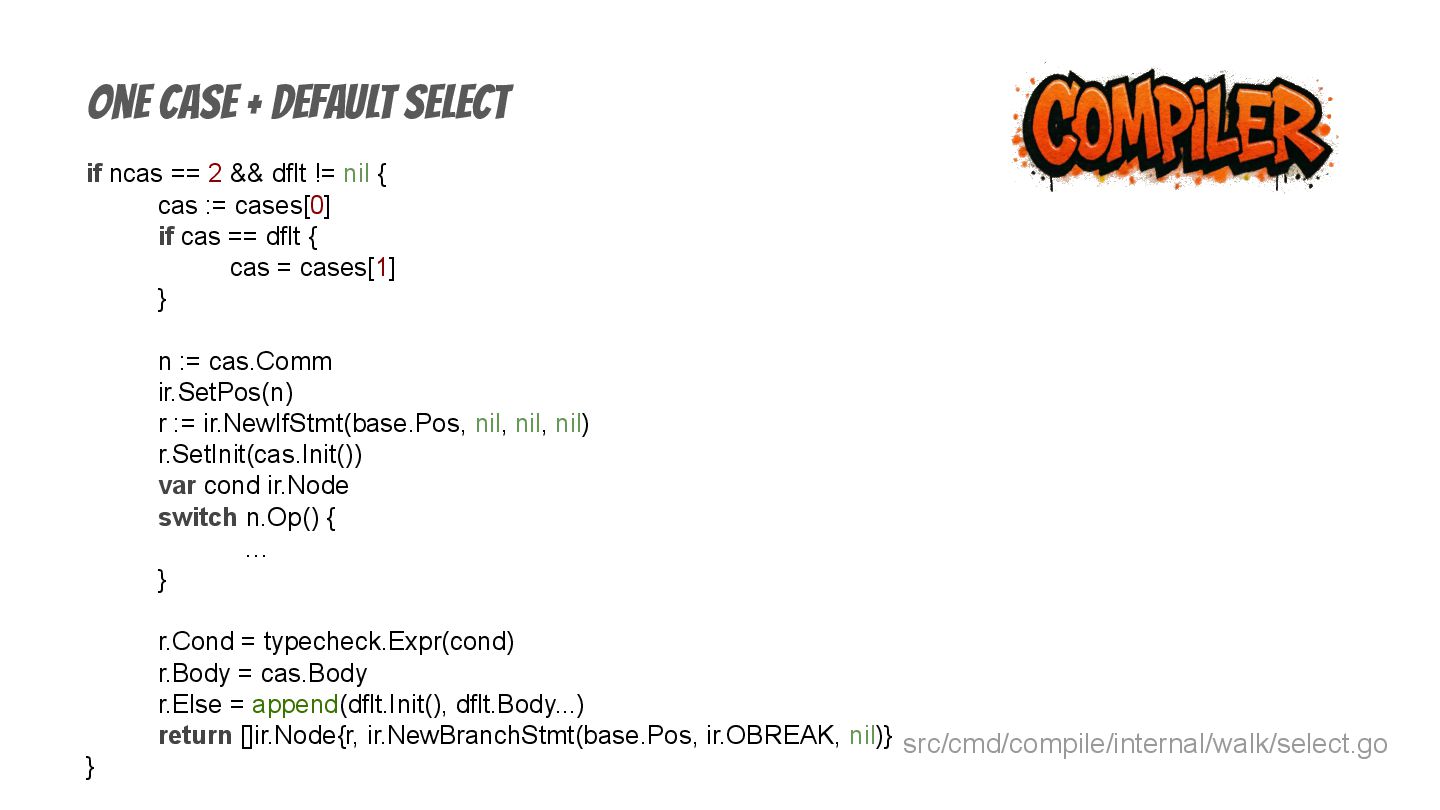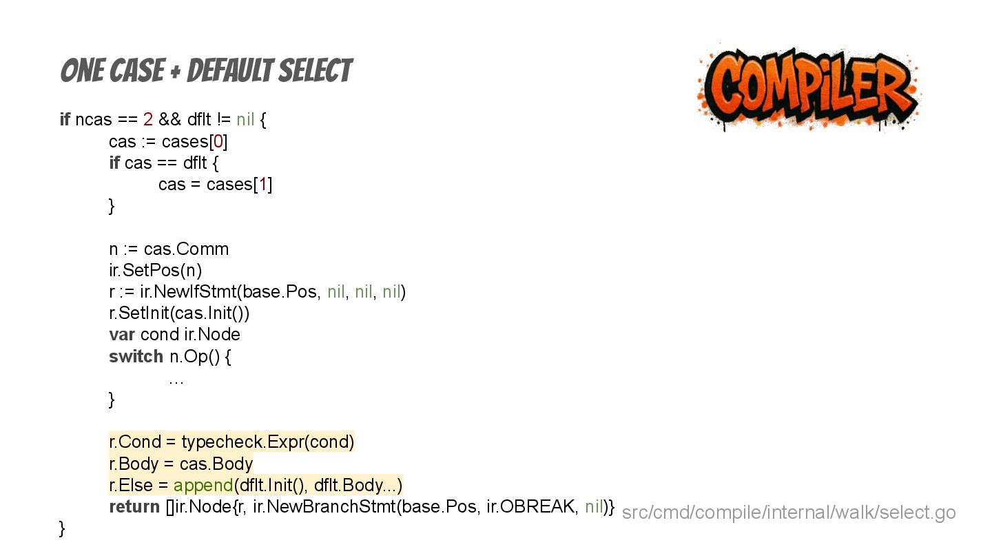 cases[0] ir.SetPos(cas) l := cas.Init() if cas.Comm != nil { // not default: ... } l = append(l, cas.Body...) l = append(l, ir.NewBranchStmt(base.Pos, ir.OBREAK, nil)) return l } src/cmd/compile/internal/walk/select.go