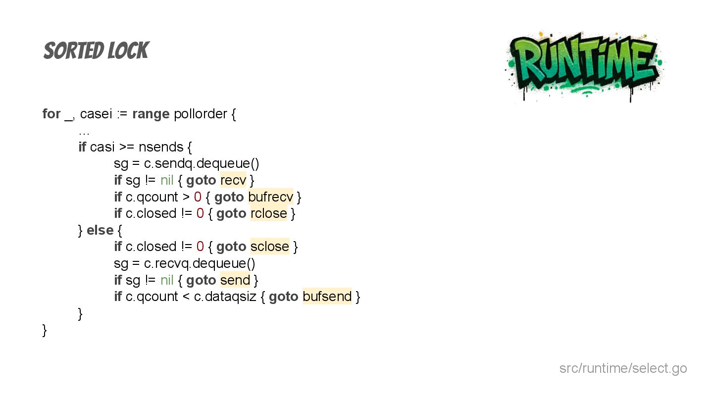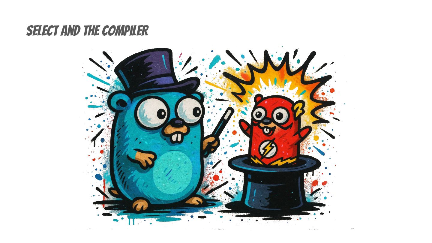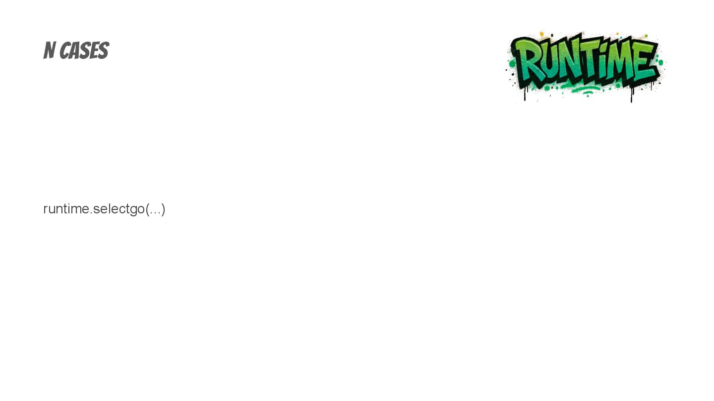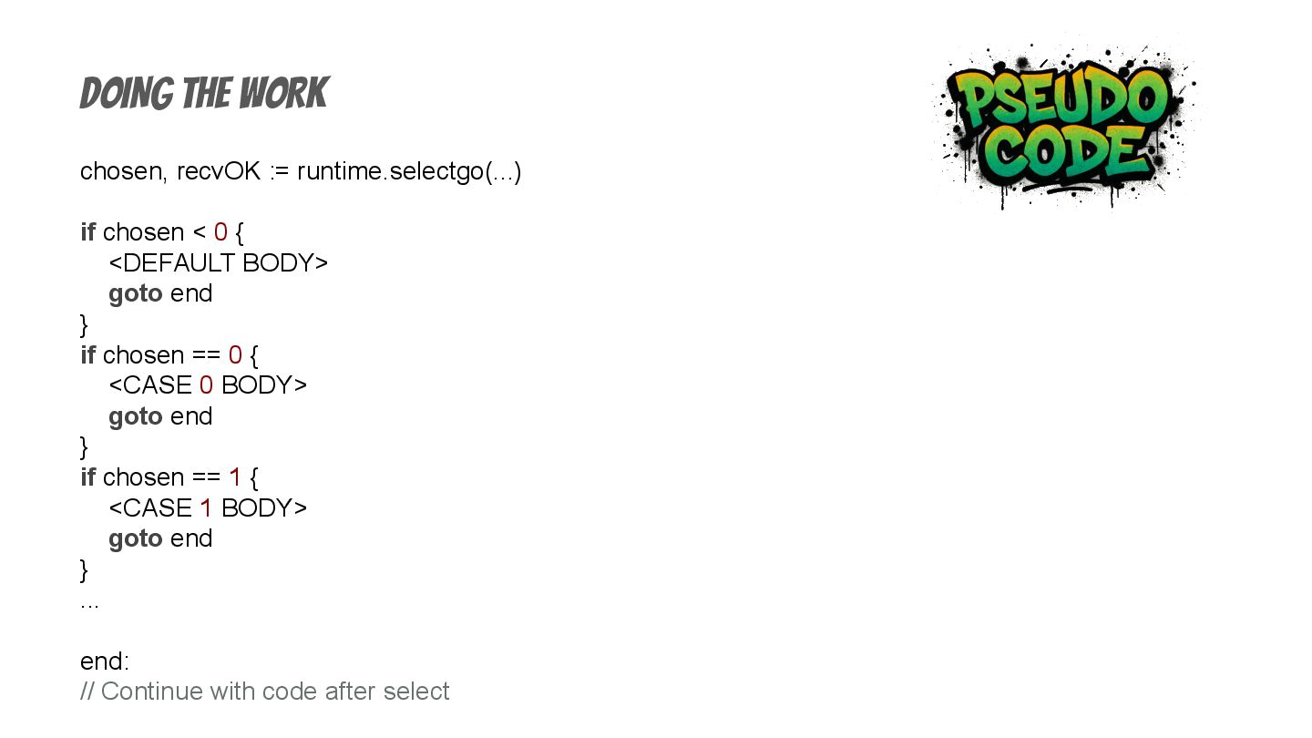 BODY> goto end } if chosen == 0 { <CASE 0 BODY> goto end } if chosen == 1 { <CASE 1 BODY> goto end } ... end: // Continue with code after select DOING THE WORK