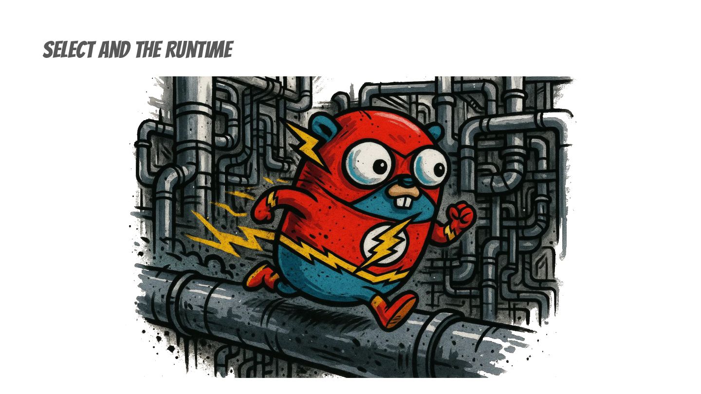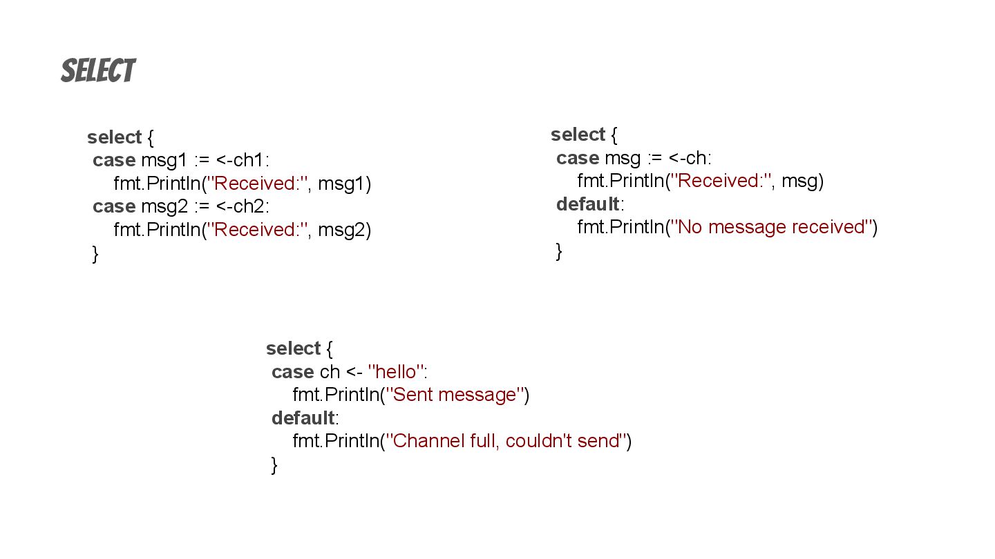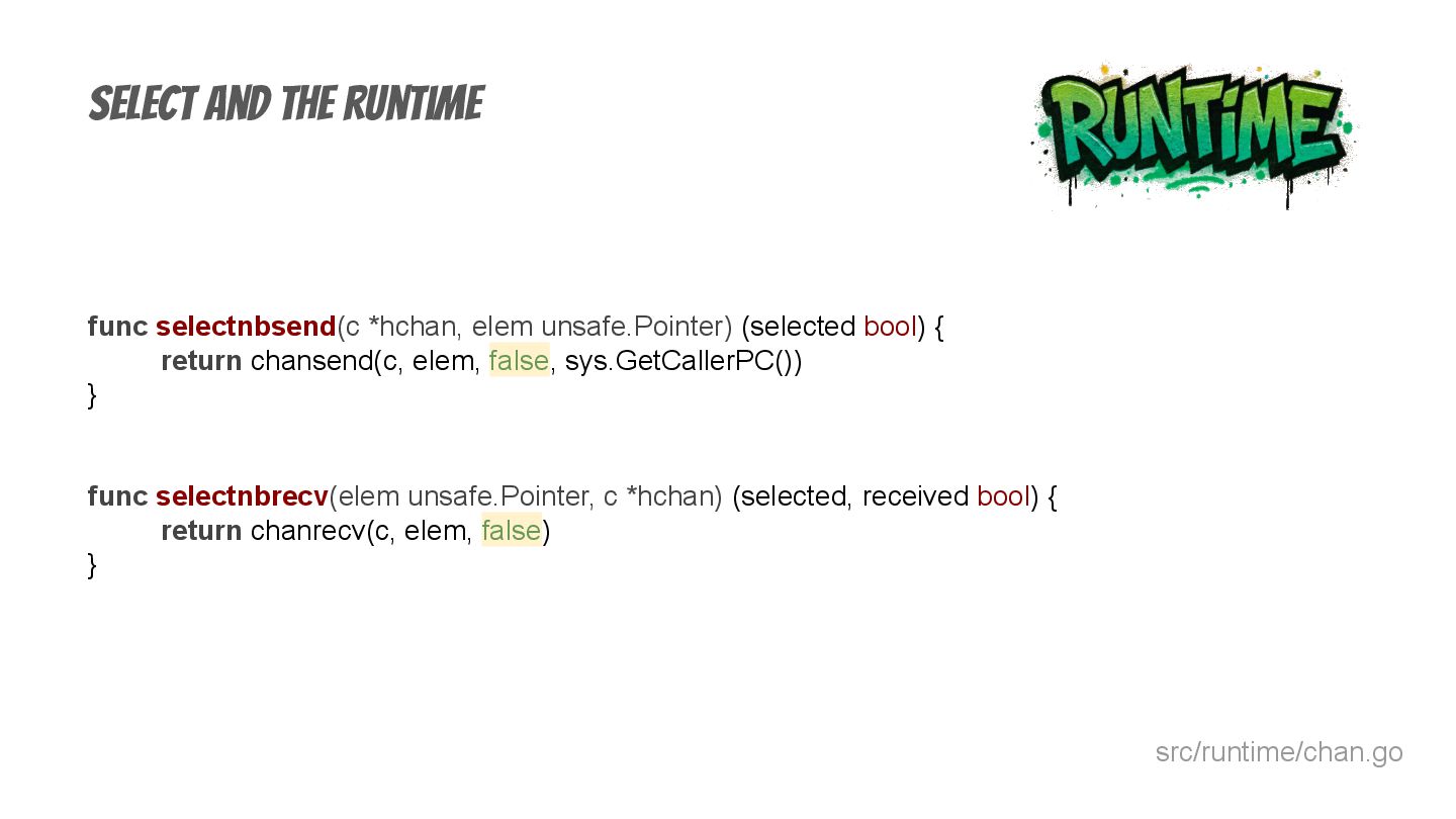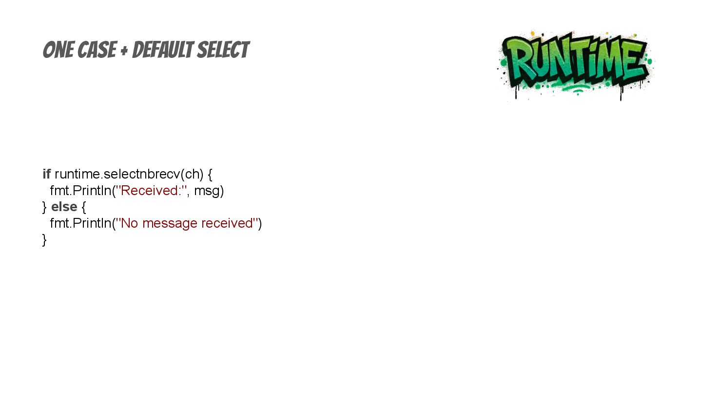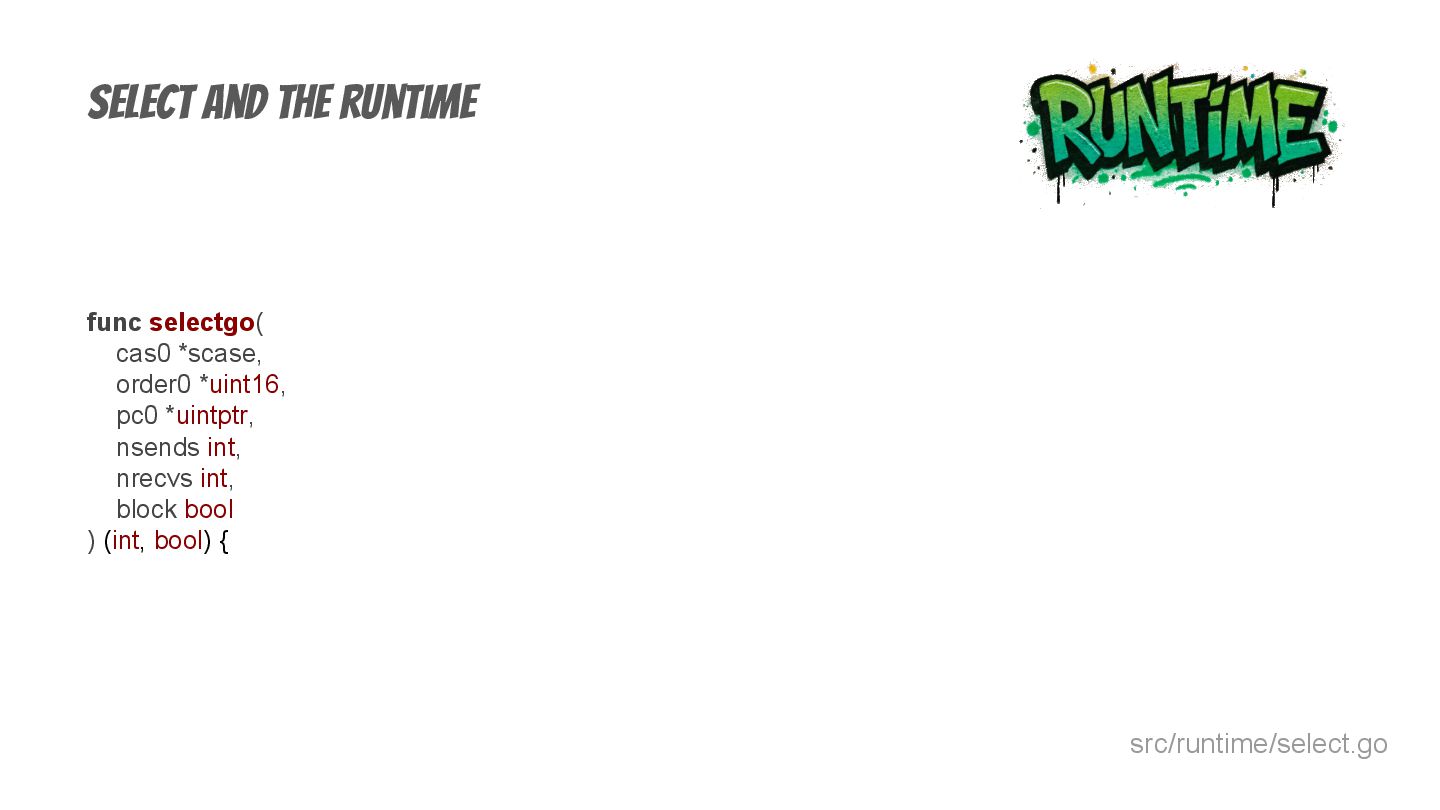 BODY> goto end } if chosen == 0 { <CASE 0 BODY> goto end } if chosen == 1 { <CASE 1 BODY> goto end } ... end: // Continue with code after select DOING THE WORK