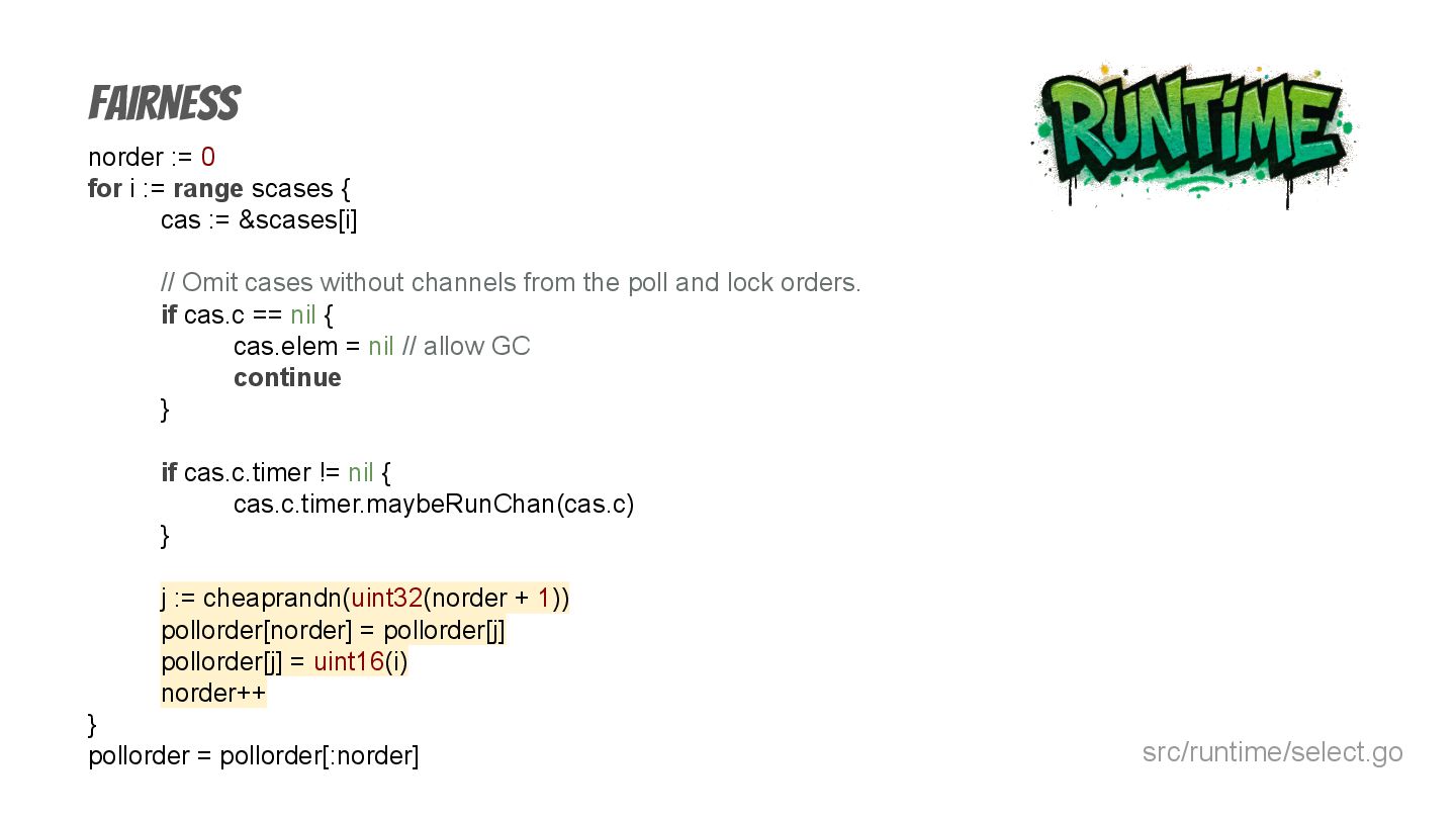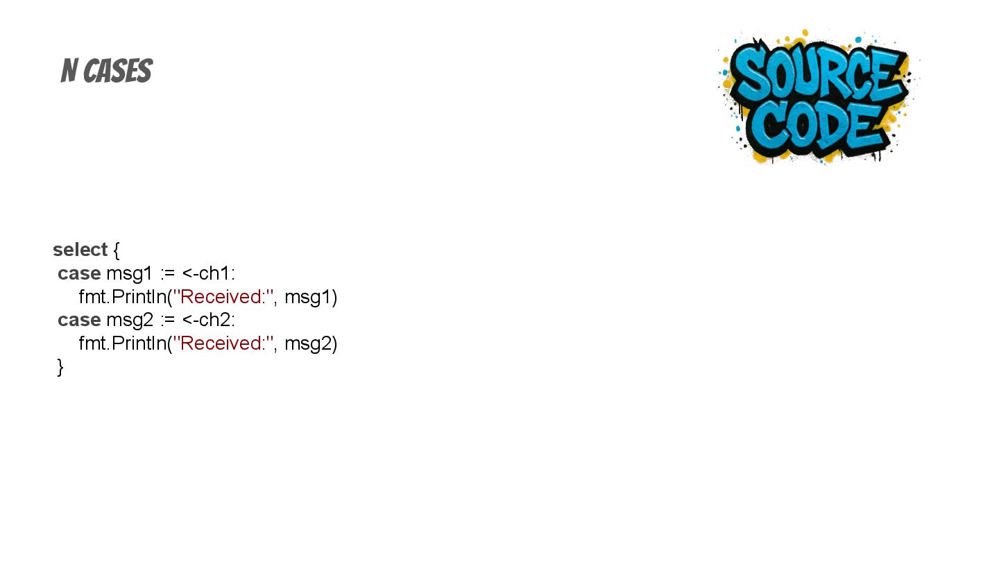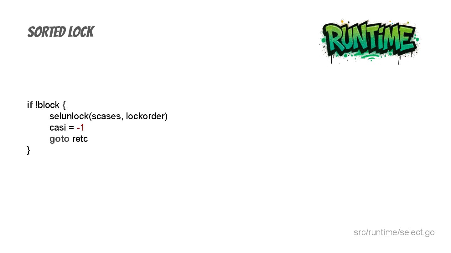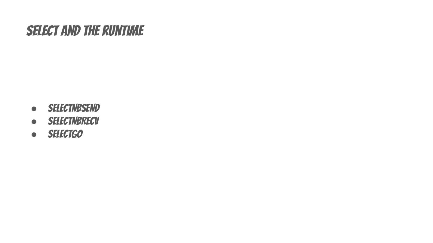 BODY> goto end } if chosen == 0 { <CASE 0 BODY> goto end } if chosen == 1 { <CASE 1 BODY> goto end } ... end: // Continue with code after select DOING THE WORK