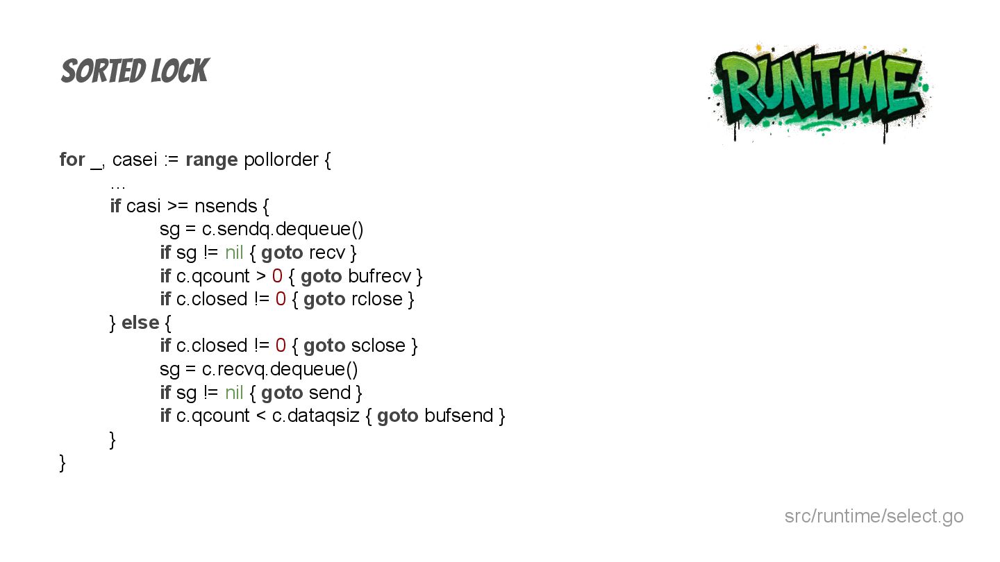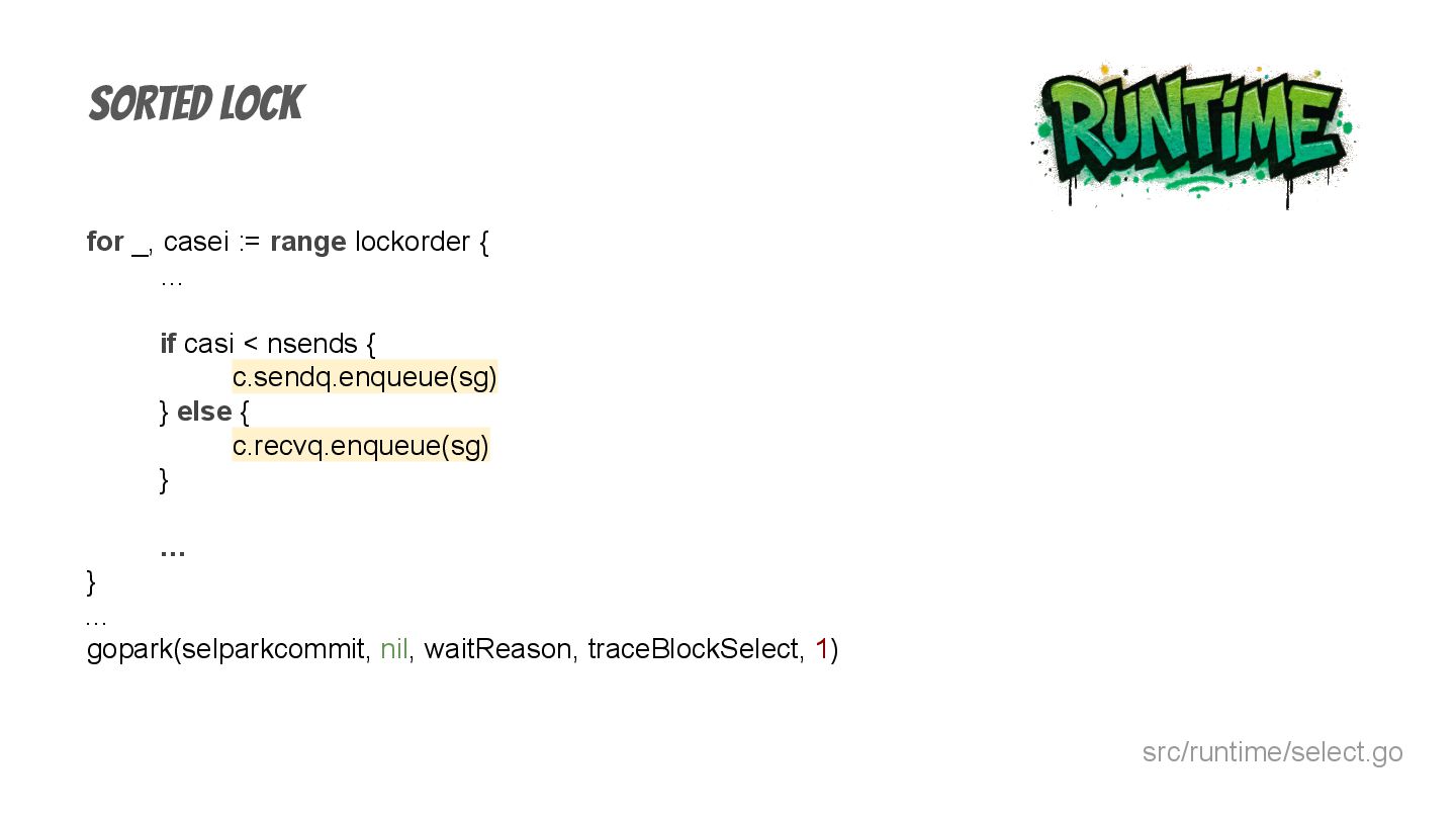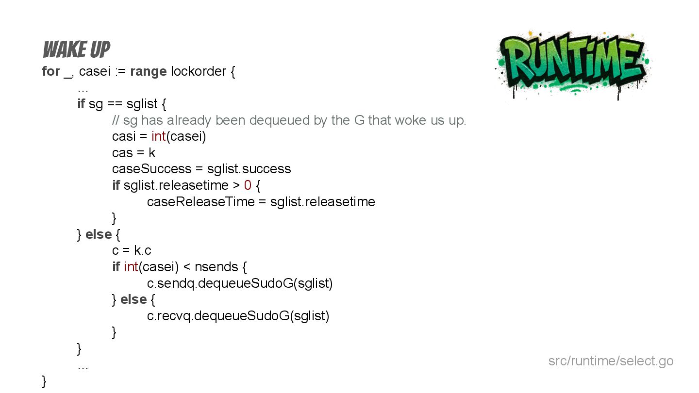… if sg == sglist { // sg has already been dequeued by the G that woke us up. casi = int(casei) cas = k caseSuccess = sglist.success if sglist.releasetime > 0 { caseReleaseTime = sglist.releasetime } } else { c = k.c if int(casei) < nsends { c.sendq.dequeueSudoG(sglist) } else { c.recvq.dequeueSudoG(sglist) } } … }