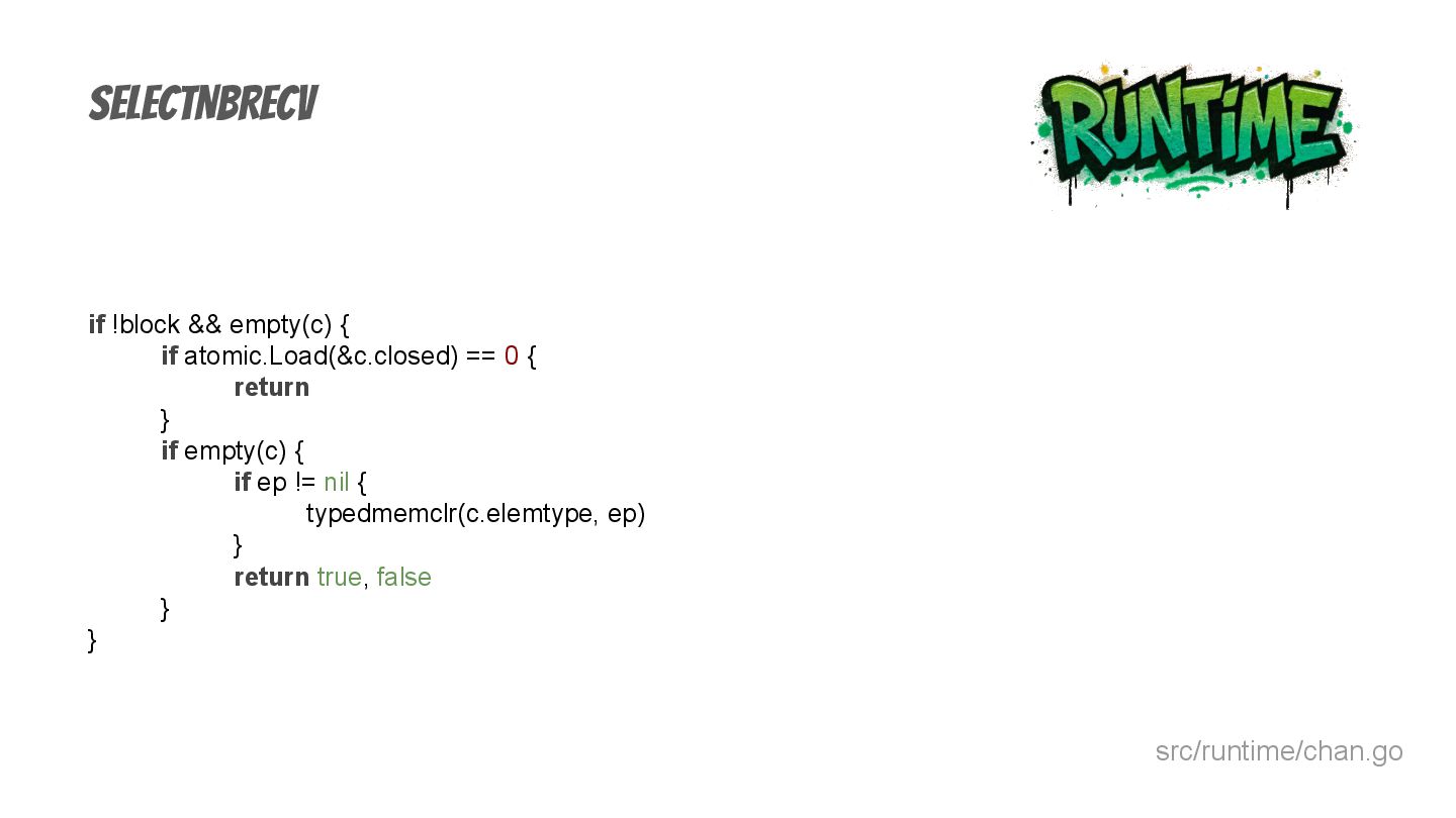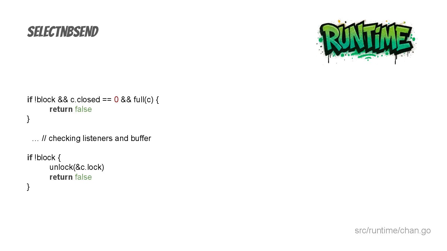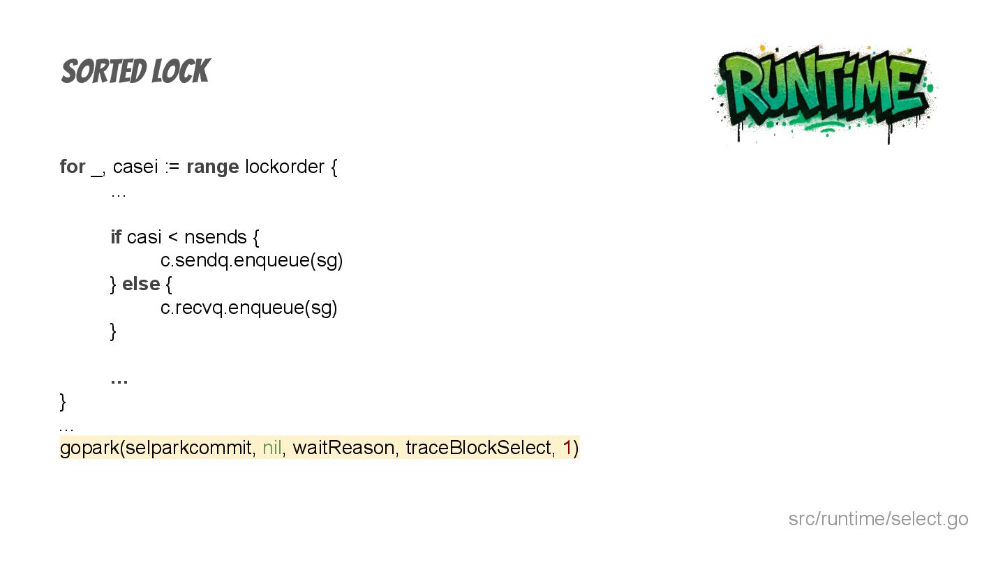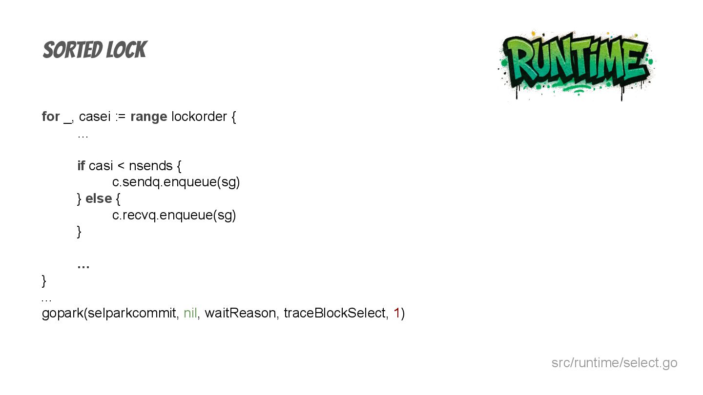 … if sg == sglist { // sg has already been dequeued by the G that woke us up. casi = int(casei) cas = k caseSuccess = sglist.success if sglist.releasetime > 0 { caseReleaseTime = sglist.releasetime } } else { c = k.c if int(casei) < nsends { c.sendq.dequeueSudoG(sglist) } else { c.recvq.dequeueSudoG(sglist) } } … }
