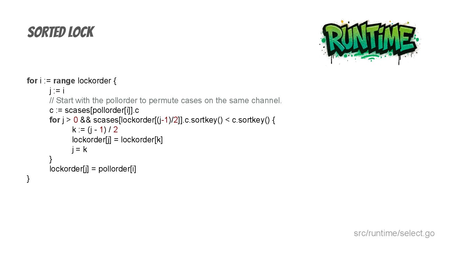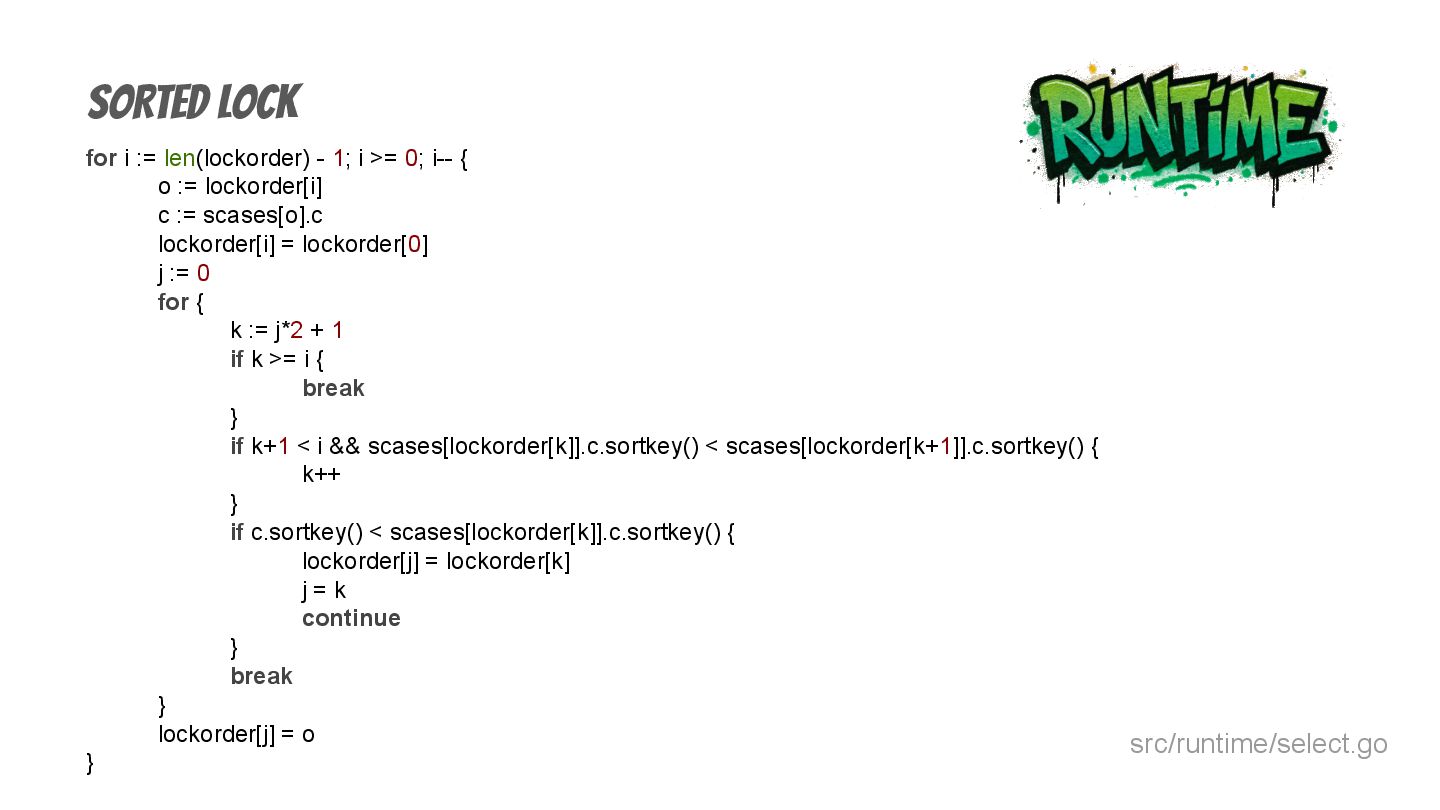 >= 0; i-- { o := lockorder[i] c := scases[o].c lockorder[i] = lockorder[0] j := 0 for { k := j*2 + 1 if k >= i { break } if k+1 < i && scases[lockorder[k]].c.sortkey() < scases[lockorder[k+1]].c.sortkey() { k++ } if c.sortkey() < scases[lockorder[k]].c.sortkey() { lockorder[j] = lockorder[k] j = k continue } break } lockorder[j] = o }