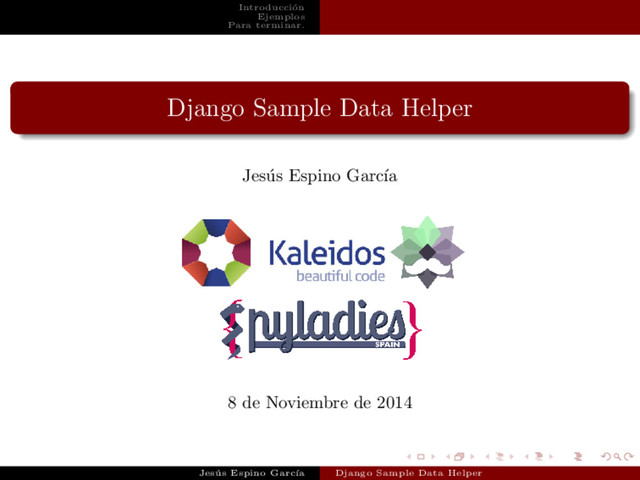 qu´ e usarlo? Datos de ejemplo (casi) gratis. Datos de ejemplo realistas. Generaci´ on de los datos repetible. Jes´ us Espino Garc´ ıa Django Sample Data Helper
