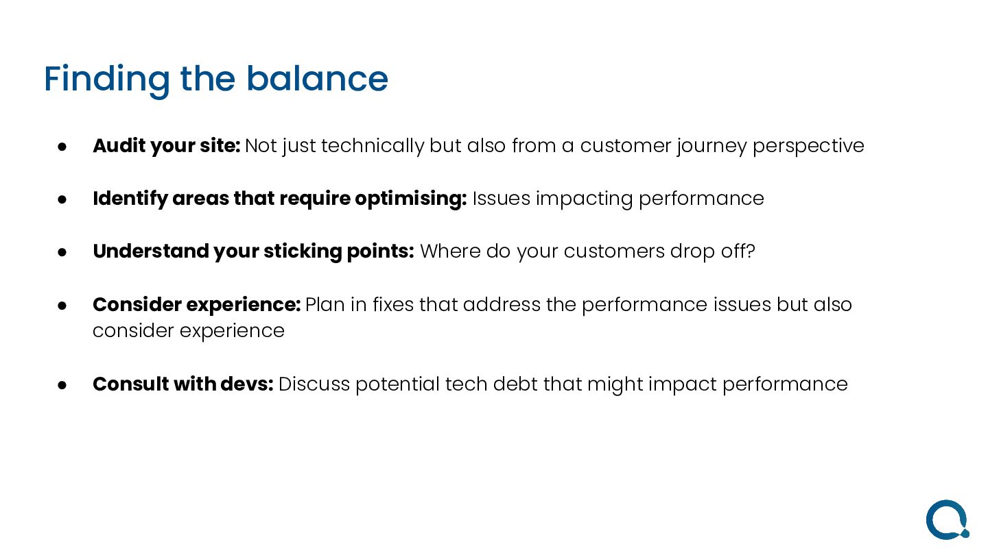 but also from a customer journey perspective • Identify areas that require optimising: Issues impacting performance • Understand your sticking points: Where do your customers drop off? • Consider experience: Plan in fixes that address the performance issues but also consider experience • Consult with devs: Discuss potential tech debt that might impact performance